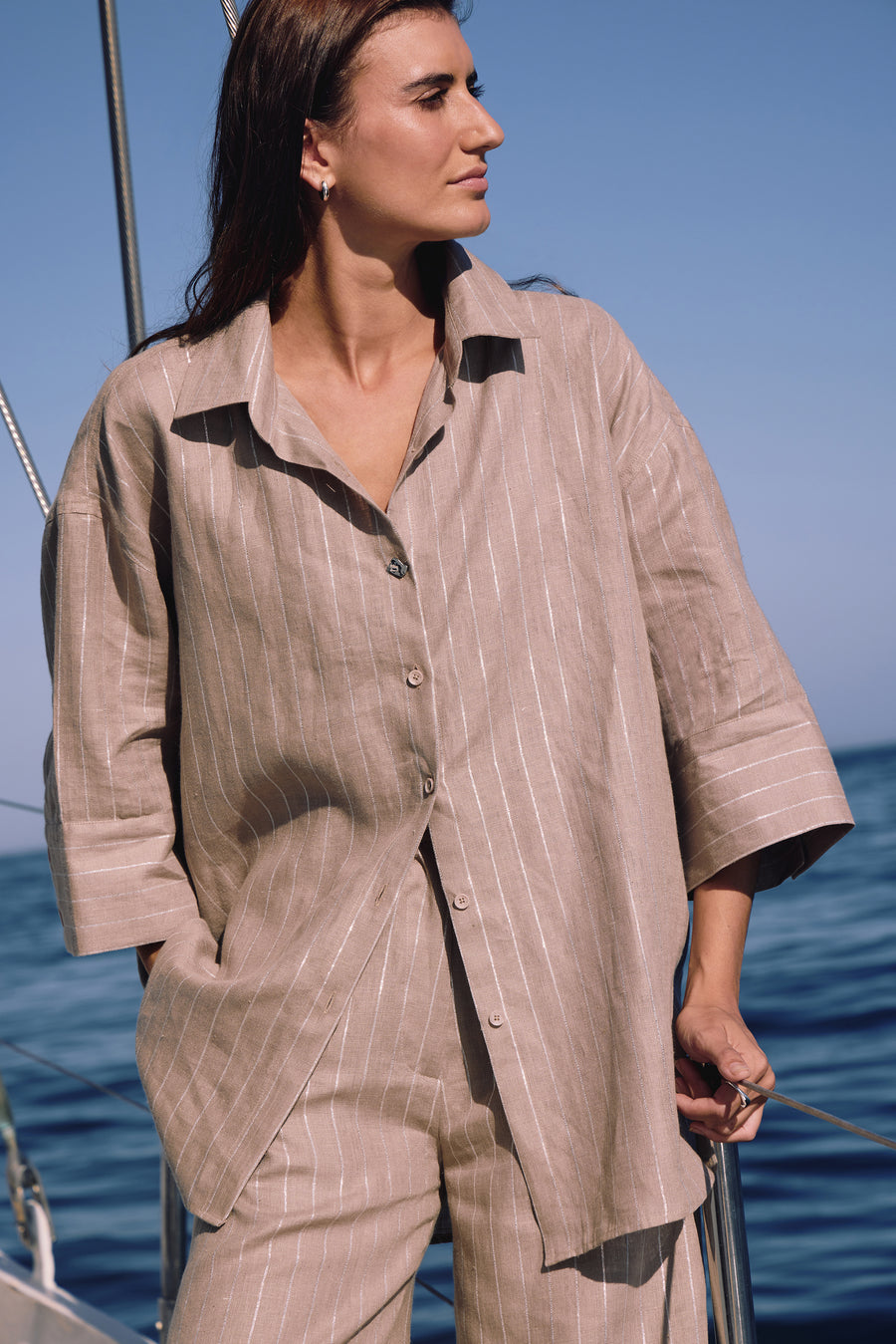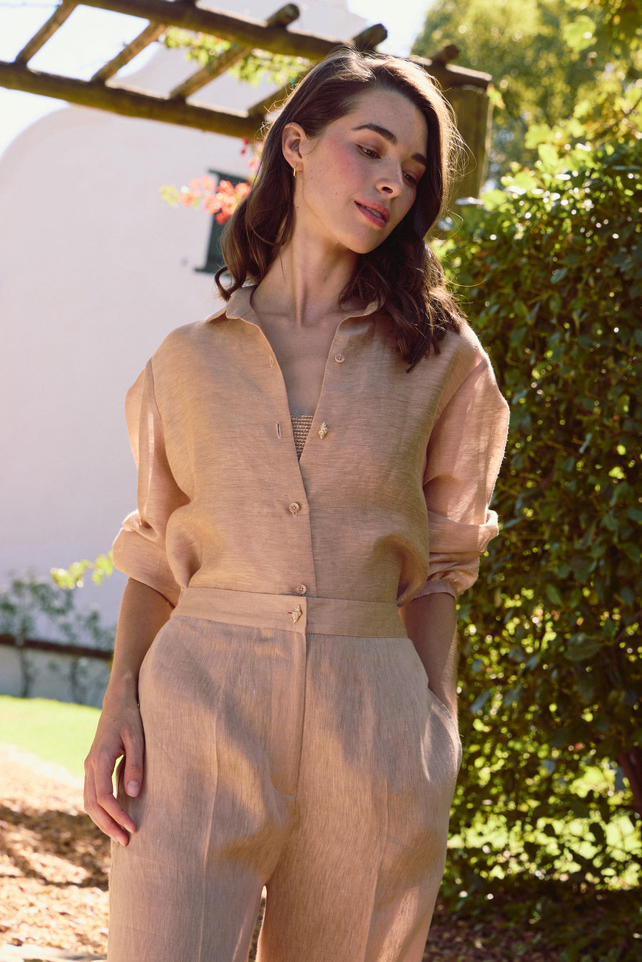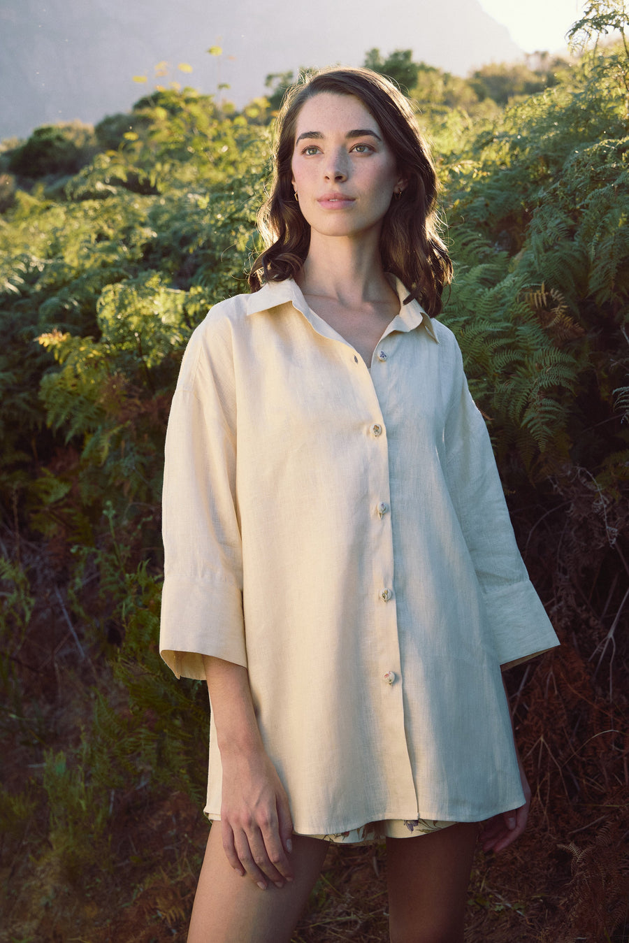 Start your summer wardrobe with a linen shirt that brings together softness, sustainability, and statement-making details. Crafted from organic linen, this fluid-fit collar shirt is the epitome of relaxed elegance. What makes it truly unique is the palm tree print patch at the back—an unexpected tropical touch that captures the essence of vacation dressing. Front lace inserts and cuff button detailing with micro palm tree print cladding add a touch of texture and personality. Whether you're heading to a resort or simply dreaming of one, this shirt makes every day feel like a summer escape.