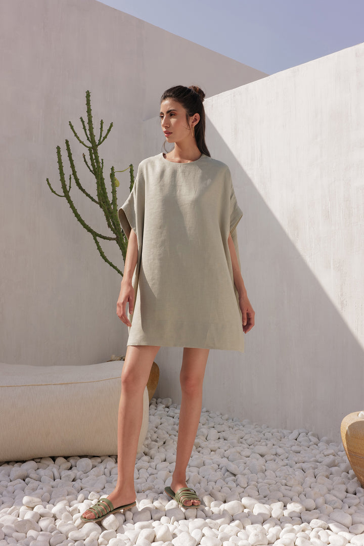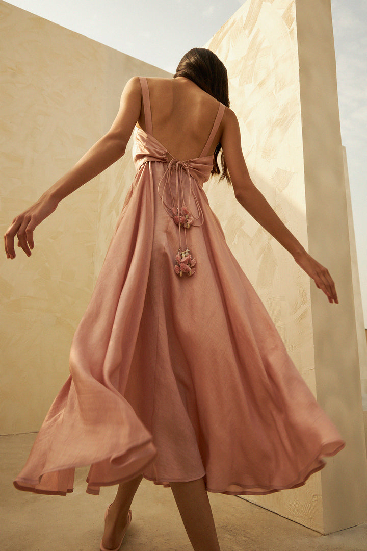 For those who love feminine, flowing silhouettes, this midi-length linen dress is a must-have. Crafted from sheen linen, it is lightweight, breathable, and slightly glossy, offering the perfect balance of comfort and elegance. Designed with a low back and clean drawstring ties, it is finished with chunky shell bunches and tassels, adding a touch of bohemian charm to its effortless structure. Ideal for beach outings, summer brunches, or evening strolls, this versatile dress can be styled with strappy sandals and a woven tote bag for the ultimate vacation-ready look.