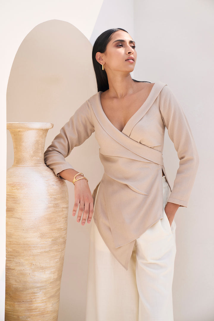 The Chilling Woolen Top in ivory is the perfect blend of elegance and comfort. Made from lightweight soft wool with a herringbone weave, this woolen top features a stunning asymmetric design that is both modern and minimalist. The soft-edged seams and statement buttons with contrast floral embroidery add a touch of artistry, making this piece stand out from the rest. With full sleeves and a relaxed fit, it offers both comfort and sophistication, making it perfect for versatile styling.