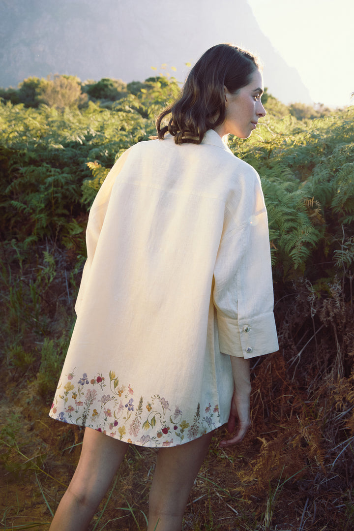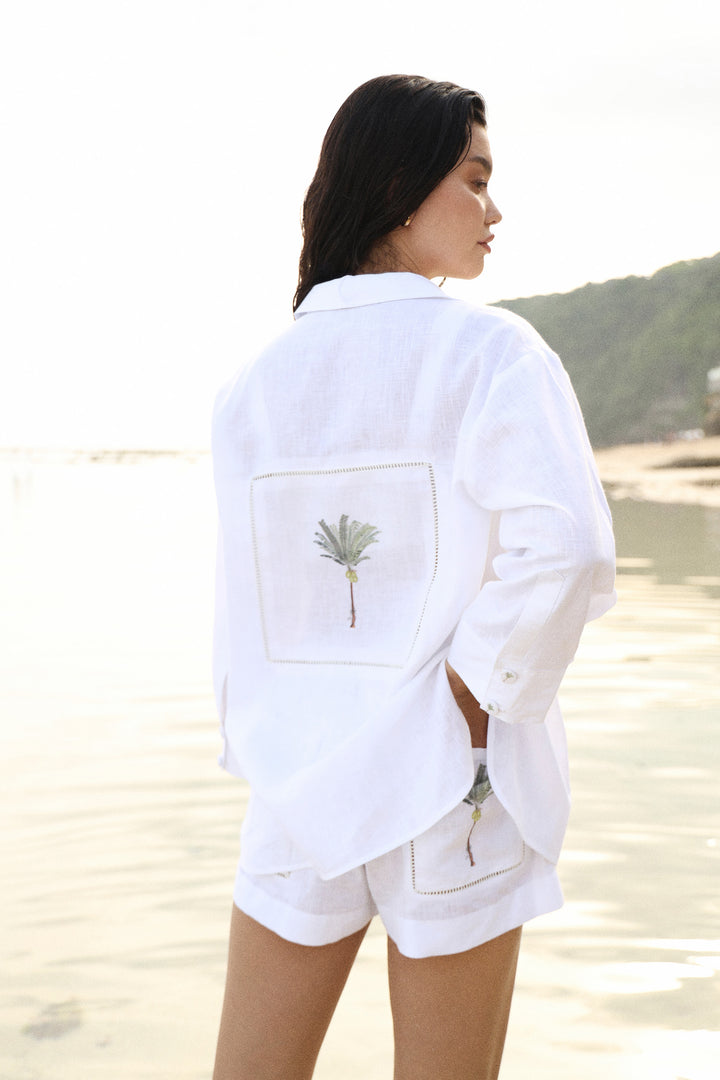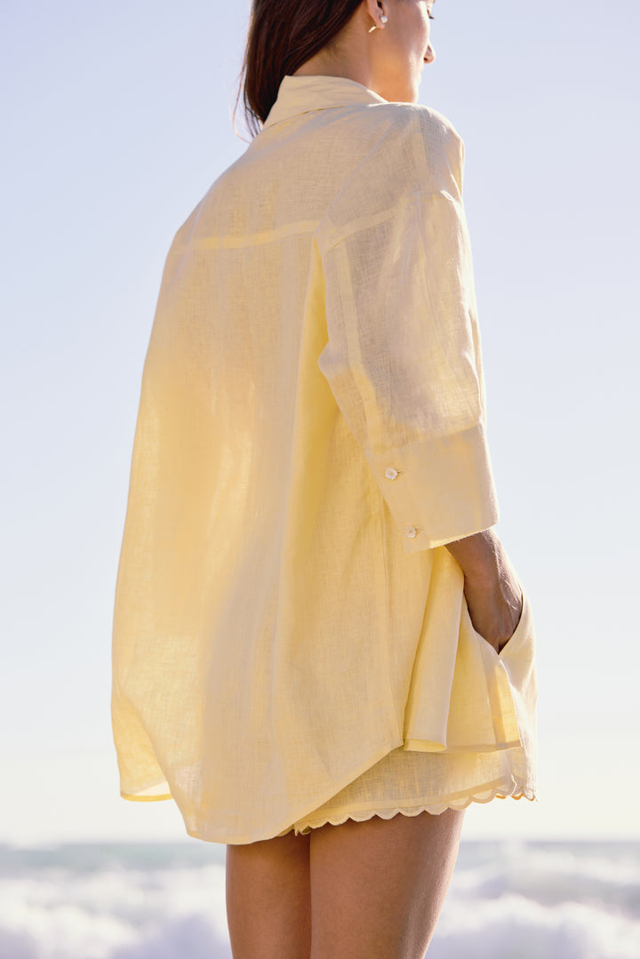 It has enough breathability for hot days at the beach and enough polish for breakfasts by the water. Wear it with linen trousers or open over swimwear for a simple but elegant look.