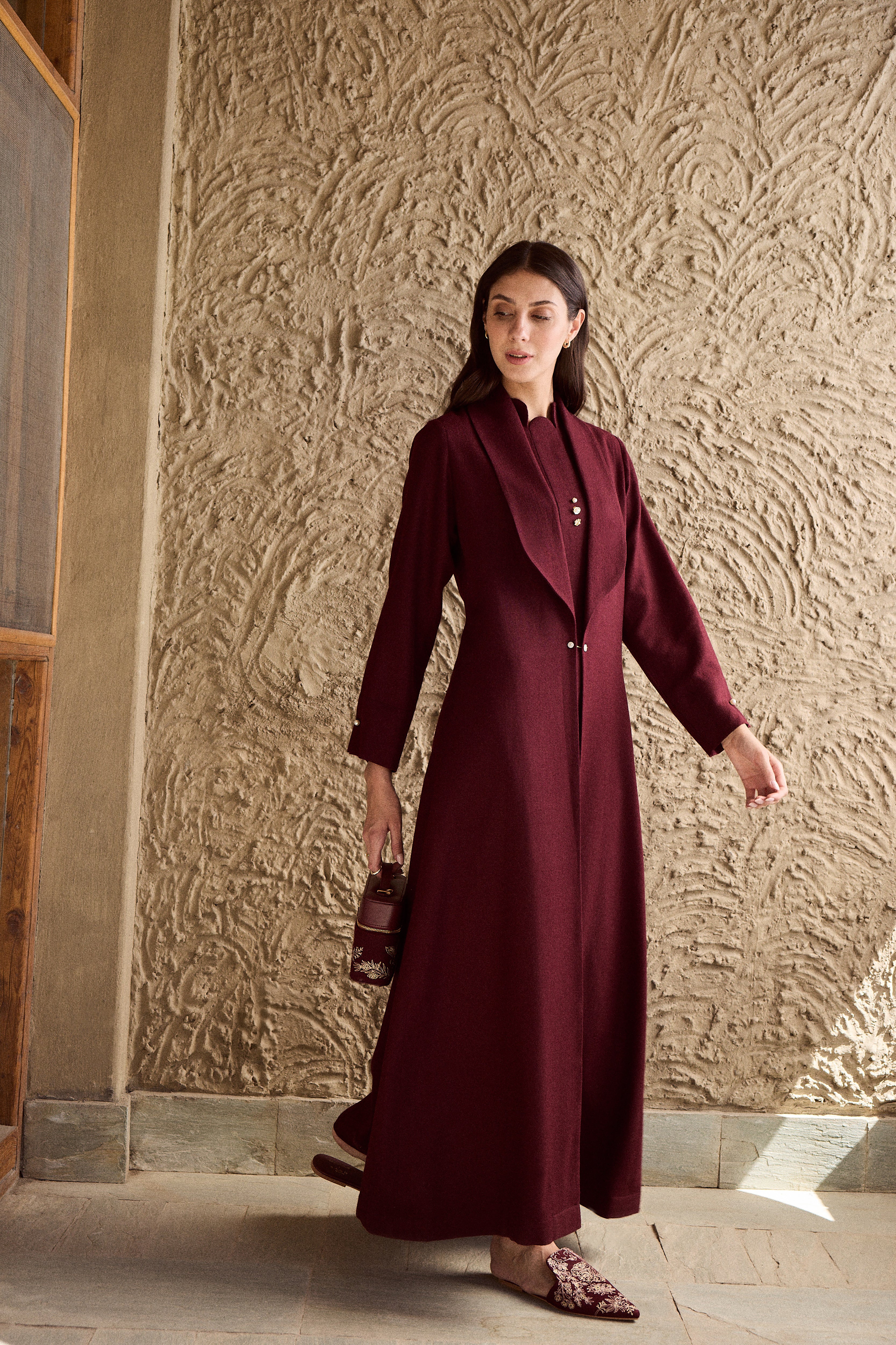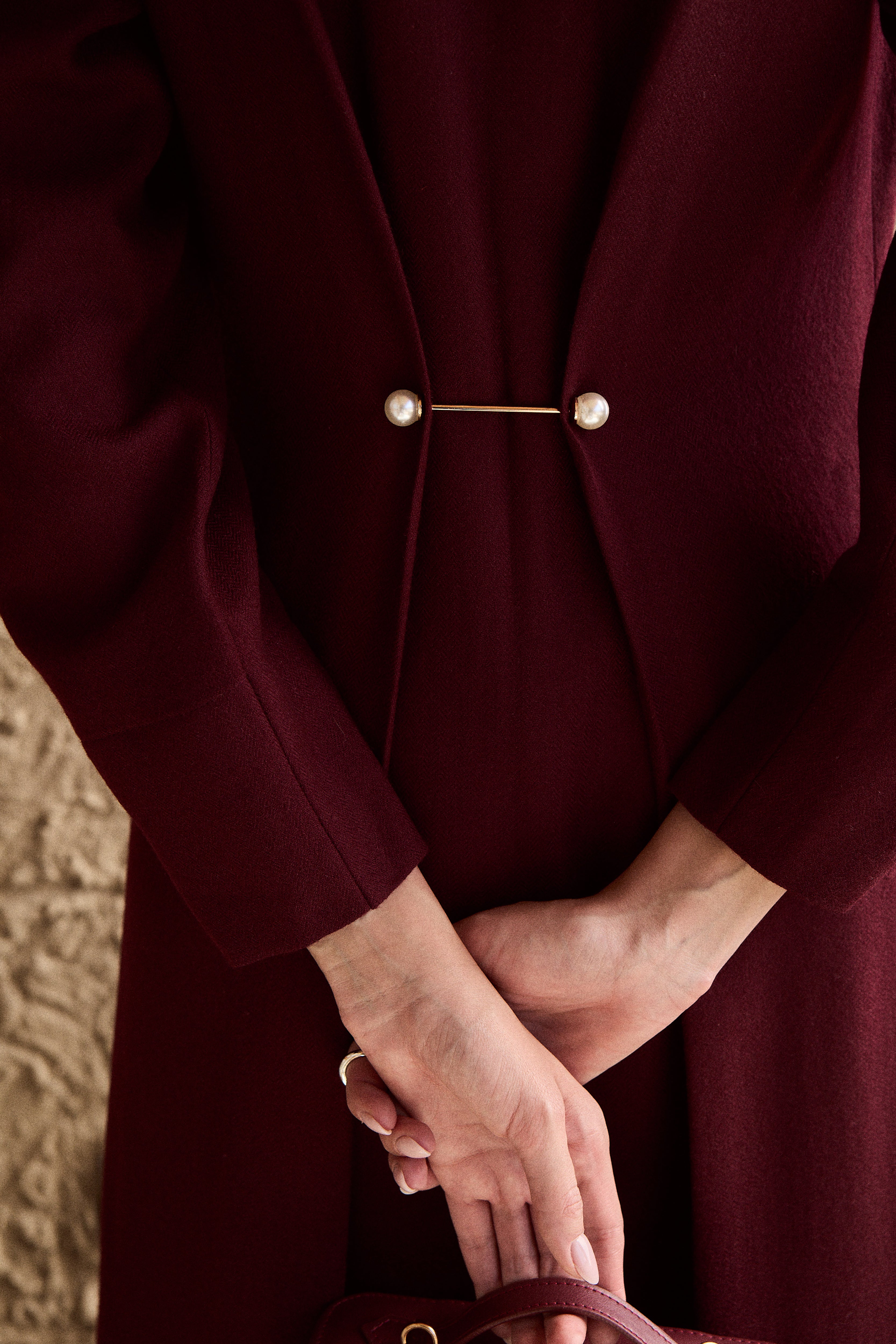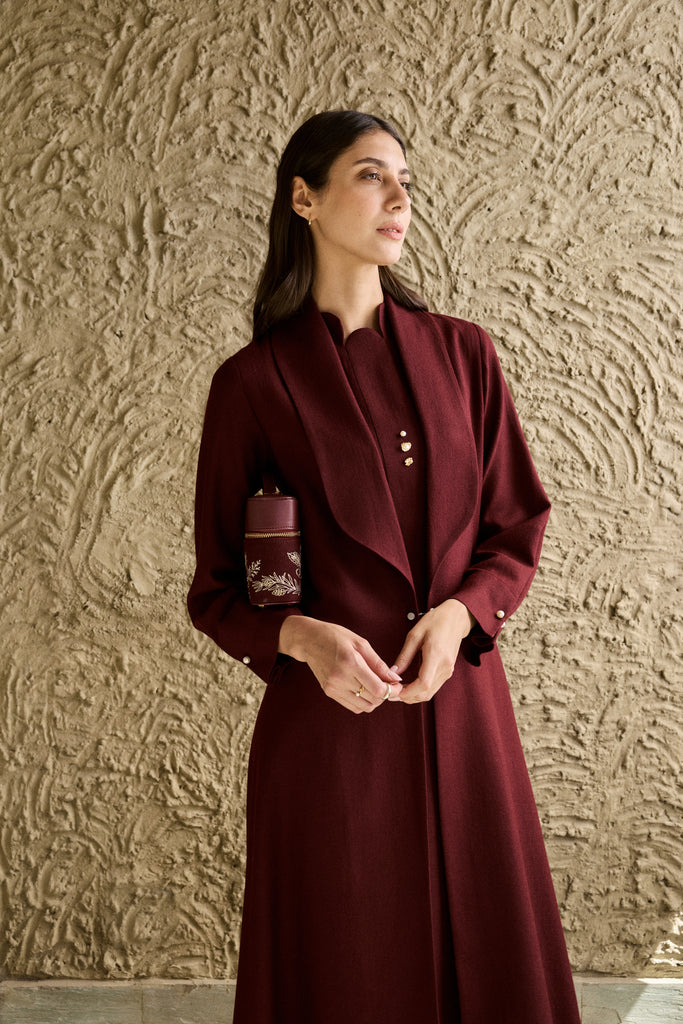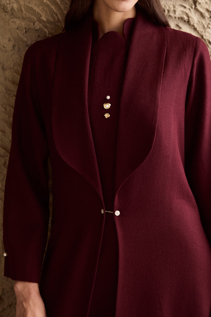 Barot Woollen Overlay (Merlot) - This Merlot overlay in soft wool herringbone is cut in a long, sculpted silhouette with a refined draped collar. Beneath the collar, jewel-like buttons strung along a fine chain add a discreet accent of elegance, blending clean lines with subtle detail. At the back, a pearl lapel pin gathers the fabric into a soft pleat, creating a gentle cinch at the waist, while smaller pearl lapel pins at the cuffs continue the harmony of embellishment. Each lapel pin is detachable, designed to be re-styled on a scarf or other garments, offering versatility beyond the piece itself.Click Here