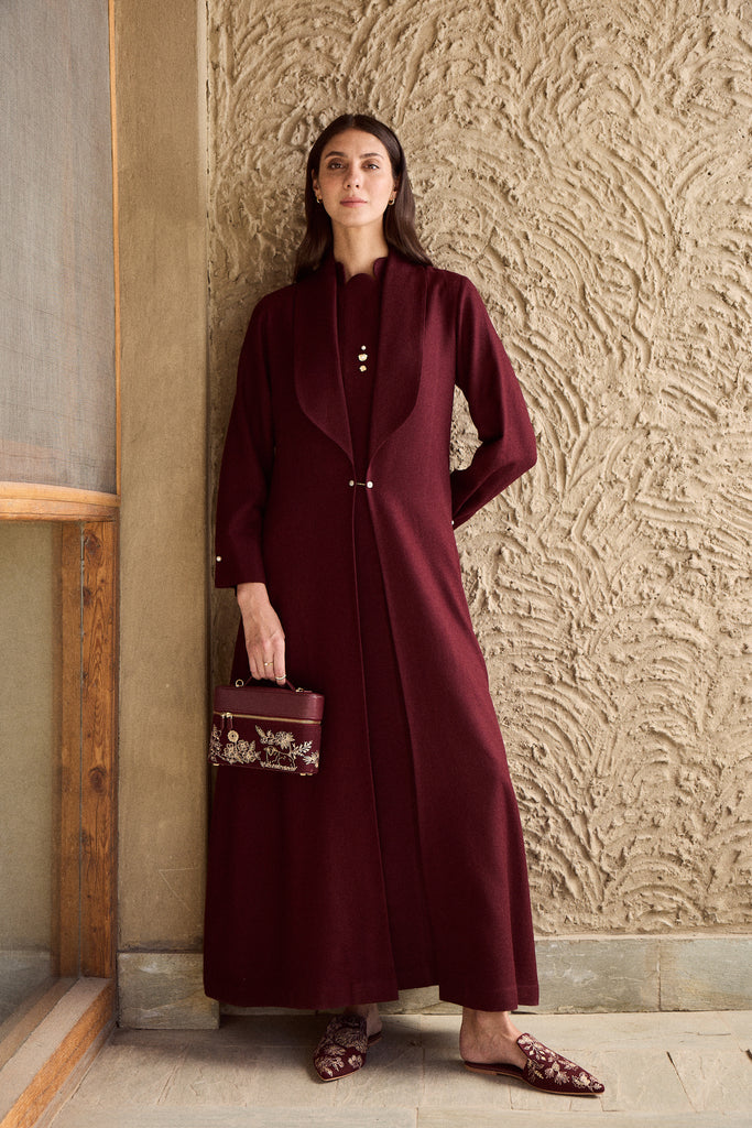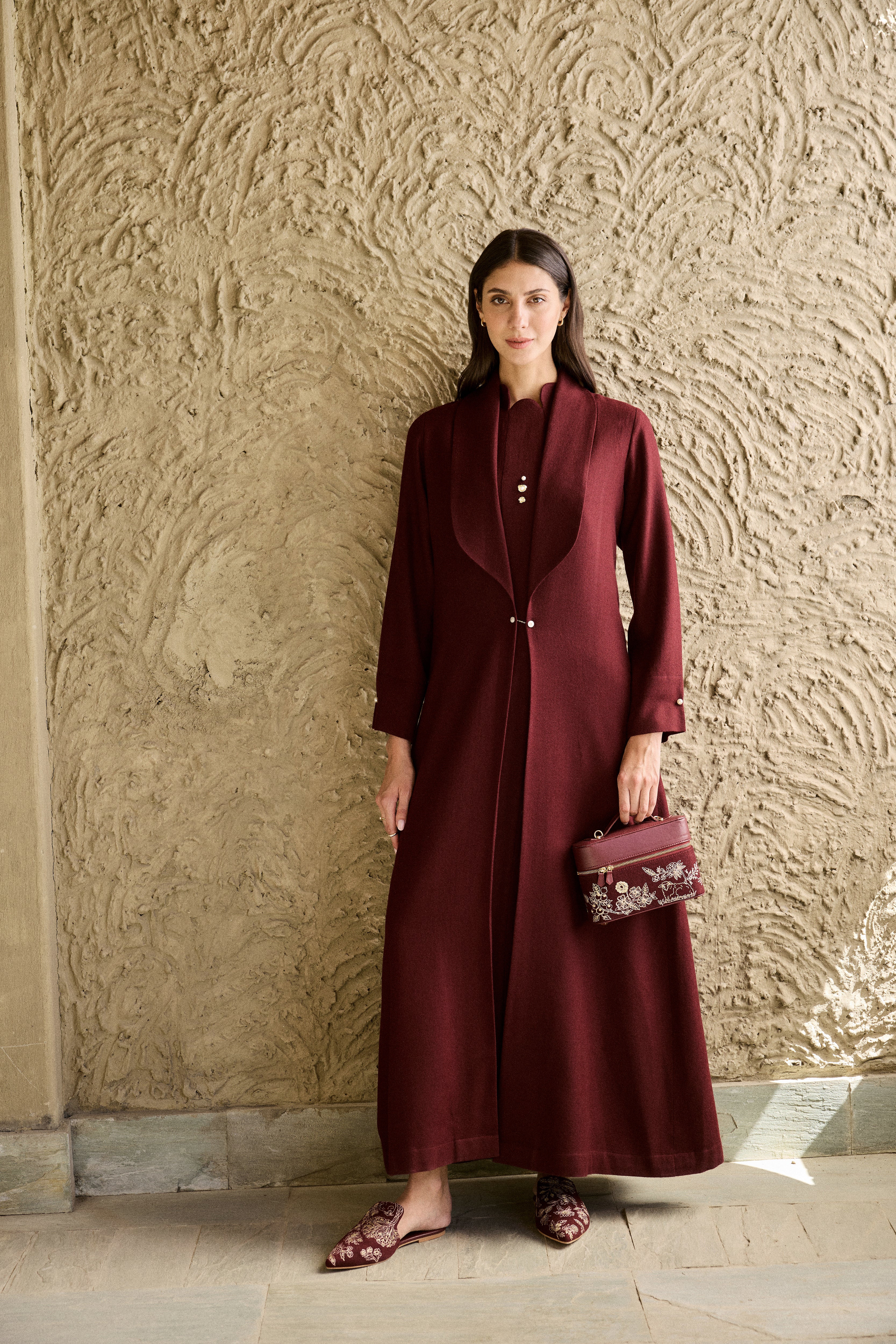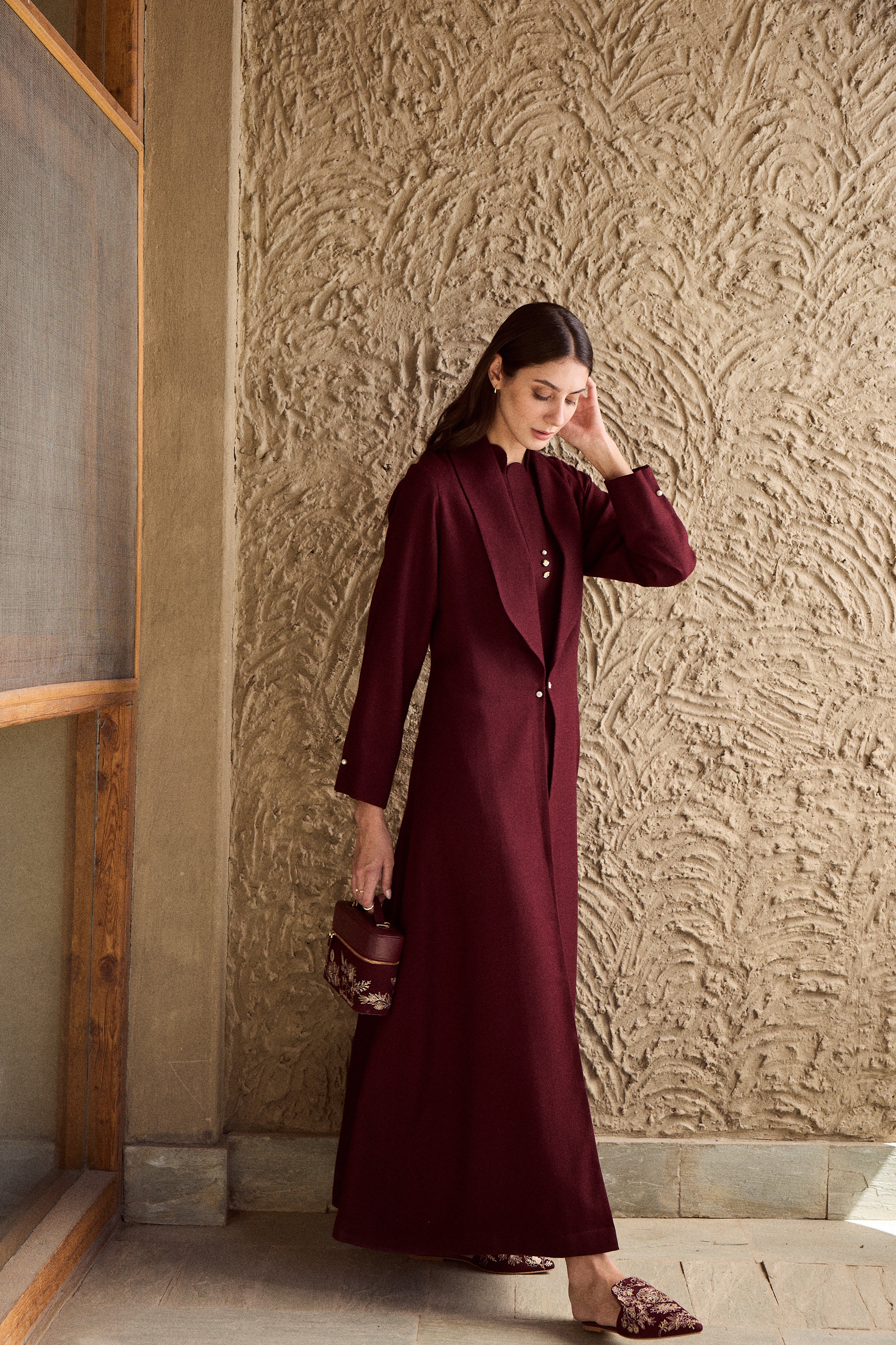 Barot Woollen Overlay (Merlot) - This Merlot overlay in soft wool herringbone is cut in a long, sculpted silhouette with a refined draped collar. Beneath the collar, jewel-like buttons strung along a fine chain add a discreet accent of elegance, blending clean lines with subtle detail. At the back, a pearl lapel pin gathers the fabric into a soft pleat, creating a gentle cinch at the waist, while smaller pearl lapel pins at the cuffs continue the harmony of embellishment. Each lapel pin is detachable, designed to be re-styled on a scarf or other garments, offering versatility beyond the piece itself.Click Here