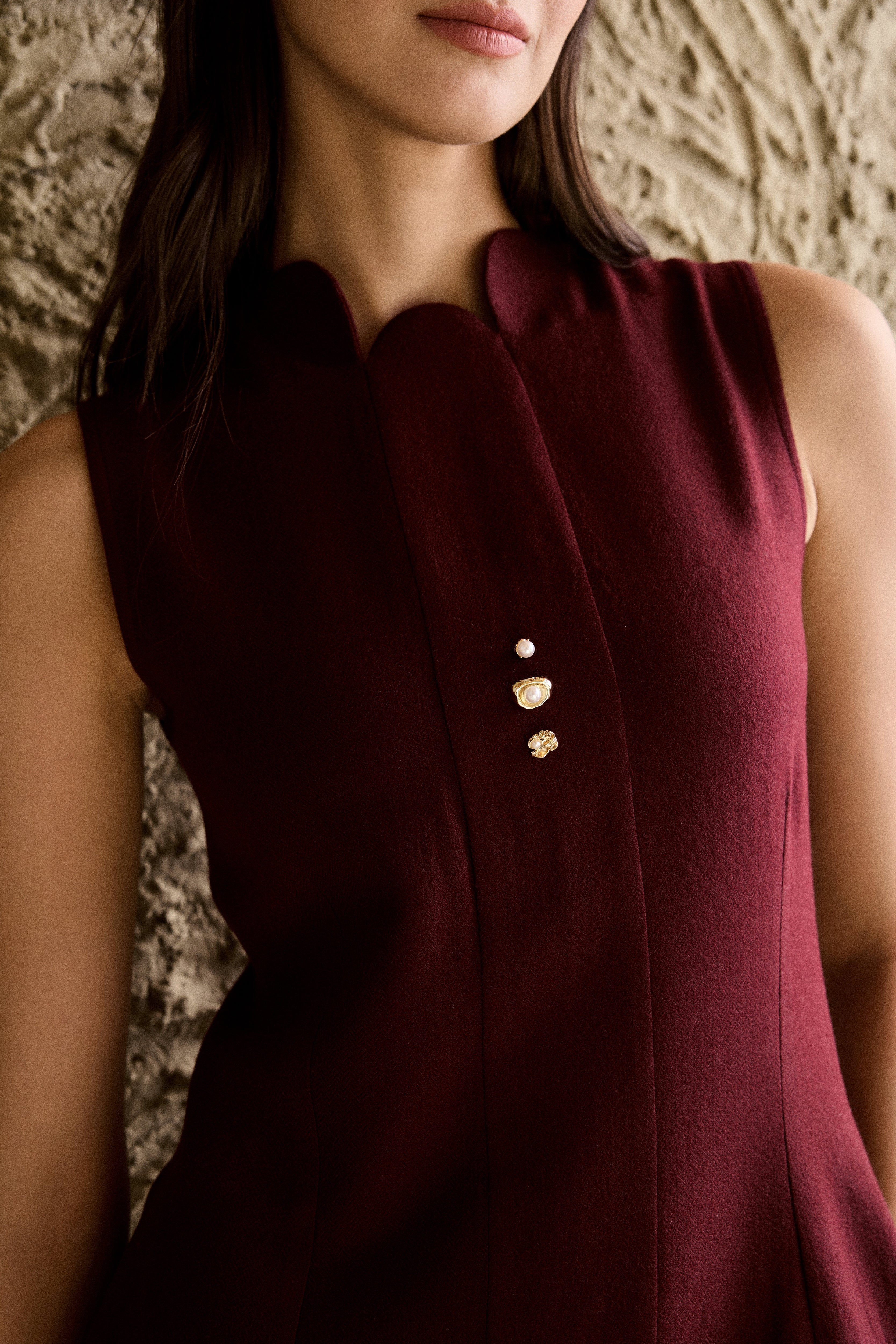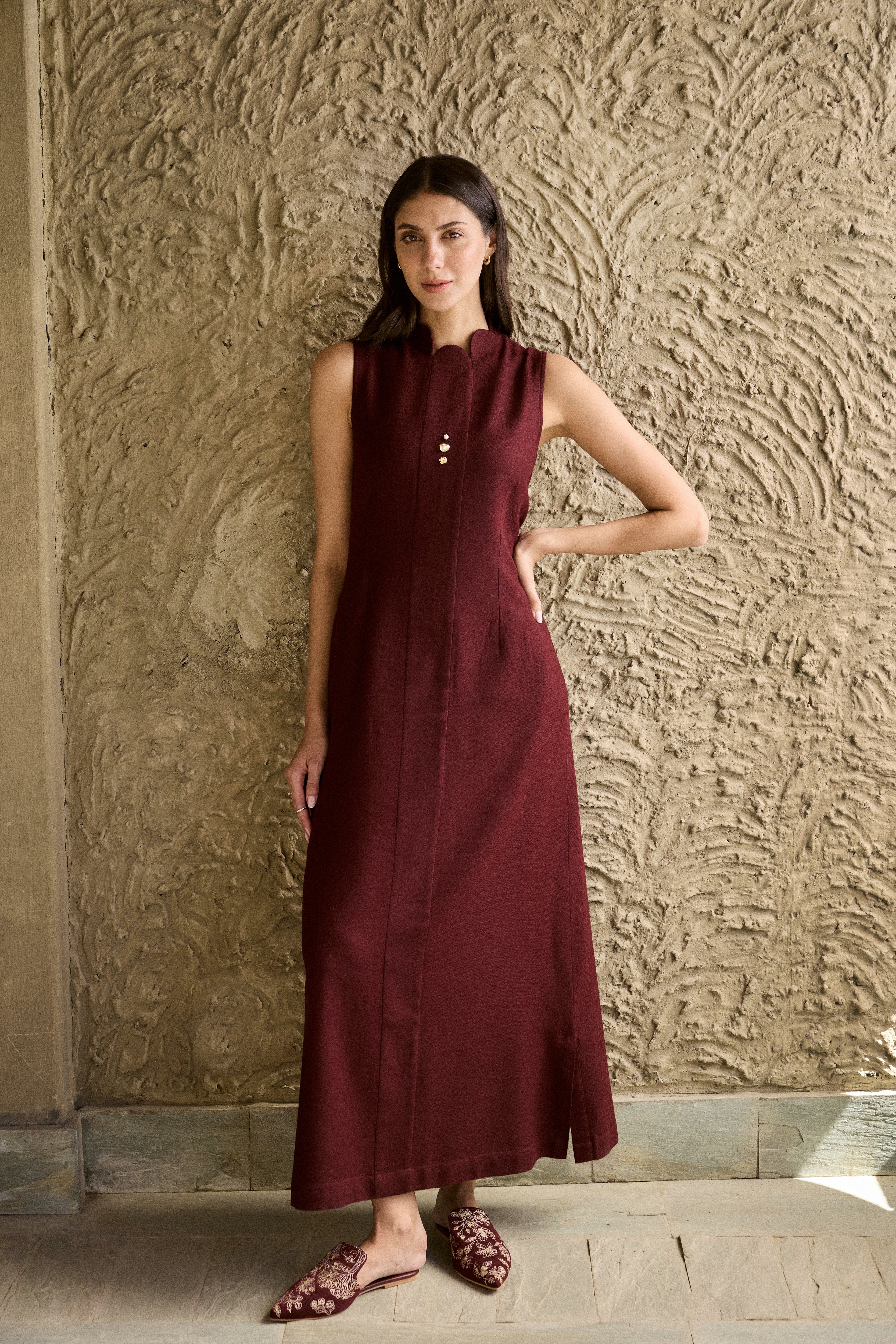 Aira Woollen Dress (Merlot) - This sleeveless long dress in deep Merlot is tailored in an elongated silhouette that lengthens the frame with effortless grace. The neckline is designed with sculpted curves that frame the collar beautifully. At its center, a trio of stunning accessory buttons adds distinction, each one unique in design, texture, and detail, evoking the elegance of miniature brooches or jewelry. Clean vertical paneling and precision stitches create structure, while the concealed zip at the back ensures a smooth fit.Click Here