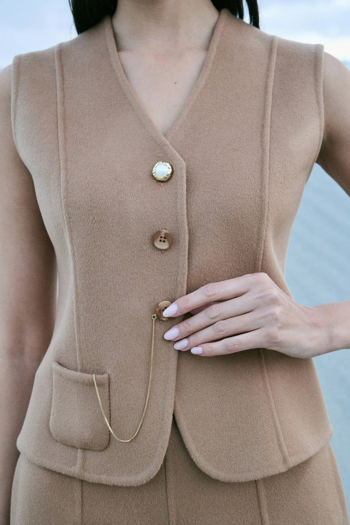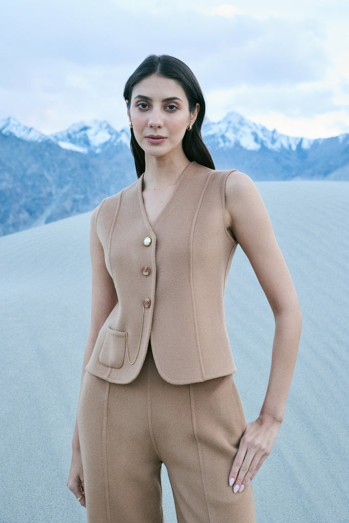 Cashmere-Silk-Merino Blend Waistcoat (Warm Honey) - At the heart of this season lies our most luxurious fabric: a rare composition of 20% Cashmere, 60% Merino Wool, 10% Silk, and 10% Recycled Binding Fiber. Designed to carry you through the depths of winter with ease, the fabric combines the lofty softness of cashmere, the resilience of merino, and the lustrous drape of silk. Its construction is light as air yet intensely insulating, offering warmth without bulk. A dual-sided weave ensures that the same supple richness touches both skin and surface, while its fluid structure lends itself to precise tailoring and sculpted silhouettes. Elevated, enduring, and indulgent- this is outerwear at its most refined expression.Click Here