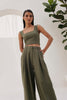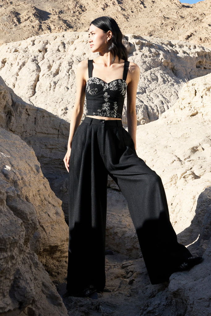 Crafted from soft, lightweight wool, these wide-legged long pants feature front pleats and convenient side pockets. The belt waistband includes an elasticated back, ensuring a comfortable fit. Elevate your style with this perfect blend of sophistication and ease.
