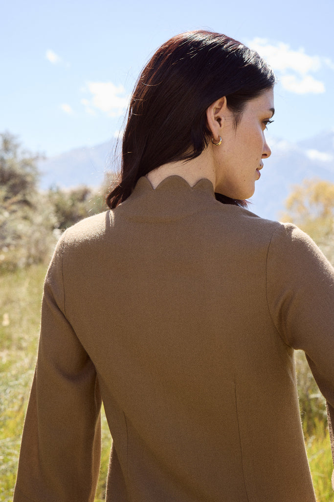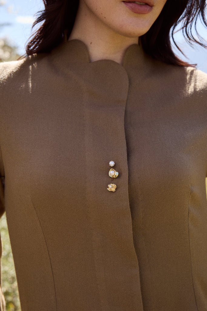 Aira Woollen Top (Valley Clay) - Tailored in soft wool in the earthy shade of Valley Clay, this top is designed with a scallop collar and a concealed placket that gives it a clean, fluid front. At its center, a trio of stunning accessory buttons adds distinction, each one unique in design, texture, and detail, evoking the elegance of miniature brooches or jewelry. The back remains understated and the gently flared sleeves lend graceful movement, making it an elevated essential.Click Here