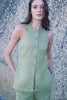 Crafted from breathable organic linen, this sleeveless button-down top is detailed with an elegant scallop-embroidered trim, adding a refined and artisanal touch. The front button closure enhances its classic appeal, while subtle side slits ensure ease of movement and a flattering fit.