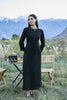 Crafted in soft wool in a deep Merlot hue, this long dress is designed with versatile elegance- it can be worn on its own or styled as a jacket or overlay. The silhouette falls gracefully with structured seams and detailed stitches that enhance its fluid drape and refined tailoring. At the neckline, delicate valley-inspired florals are embroidered in faint metallic gold and silver threads, adding a subtle touch of luminosity. The dress is finished with embroidered buttons that blend seamlessly into the design, while the long sleeves and clean front panels emphasize its timeless sophistication.