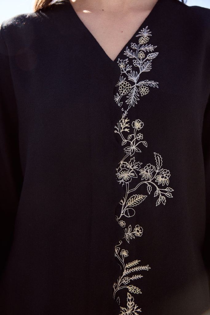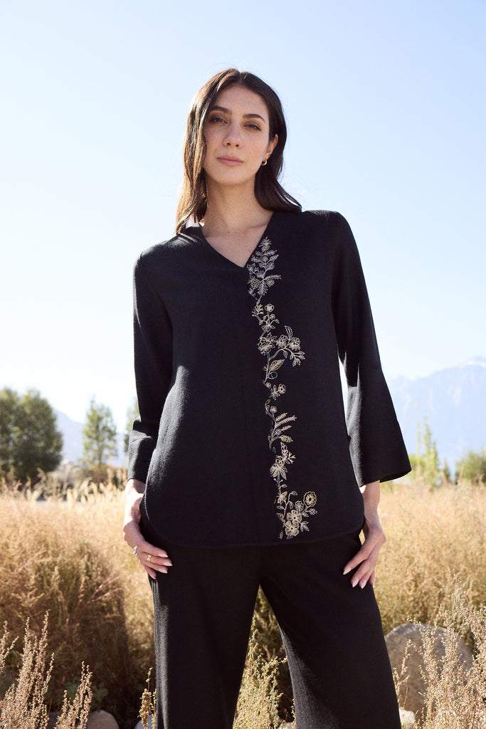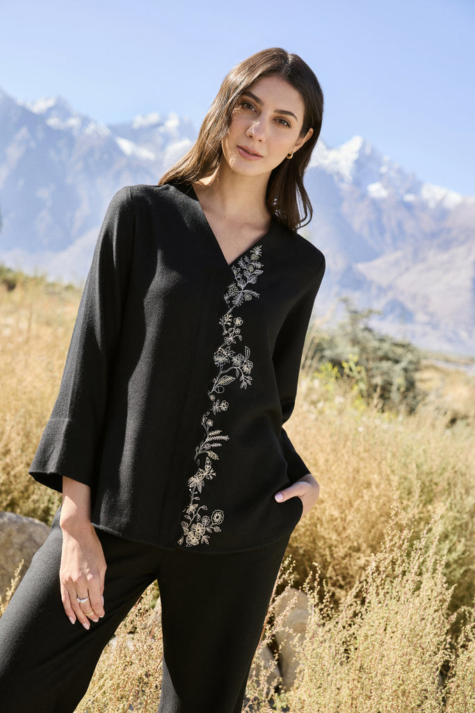 Nyoma Woollen Shirt (Black) - Crafted in soft wool, this black top is defined by its graceful V-neckline and fluid silhouette. The front is traced with faint gold and metallic silver embroidery, delicately meandering along scalloped edges and imitating the florals of the valley. Slim sleeves finish in tailored cuffs, balancing structure with ease.Click Here