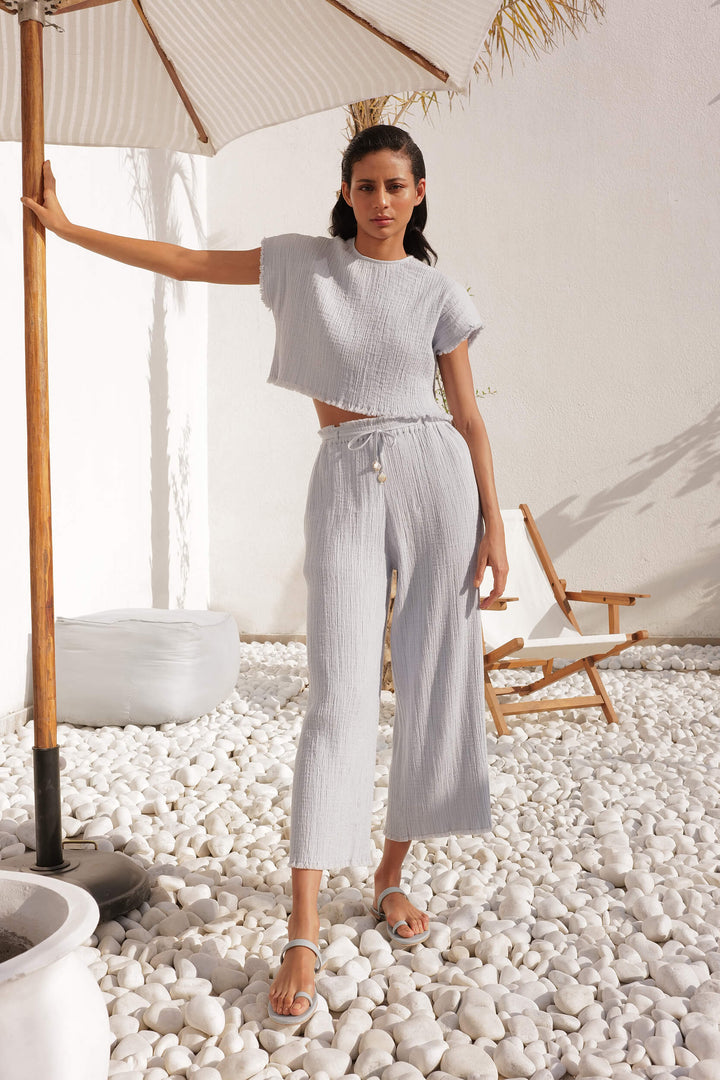 Chile Pants (Soft Blue)- Relaxed fit, crop pants made in our new seersucker cotton with frayed hem, elasticated waist and a slim shell tassel belt detail. Click Here