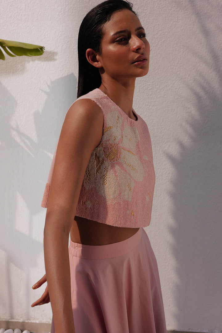 Palma Top (Dusty Pink) -An all season soft linen accessorised crop top with wide cut sleeves and a high neck, that is strong and beautiful! Handcrafted in soft pink and ivory glass beads with scatters of gold in a beautiful withering magnolia flower in the front and the lower back, with a hook at the nape of the neck for a comfort fit. Extremely versatile to pair, this crop top goes perfectly with all of our pants, skirts and overlays. Click Here