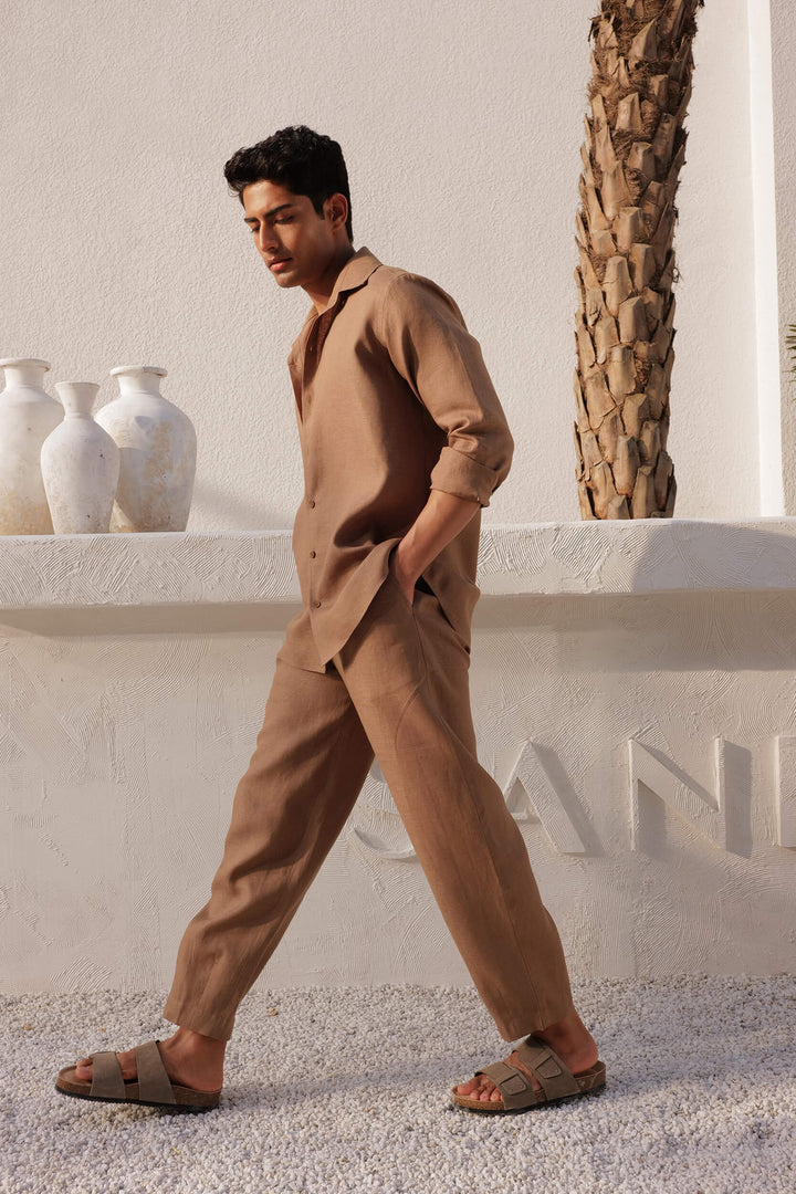Corsica Shirt - Man (Clay) - Slim fit, button down collar shirt made in 60 Lea organic linen with buttoned cuff full sleeves. Click Here