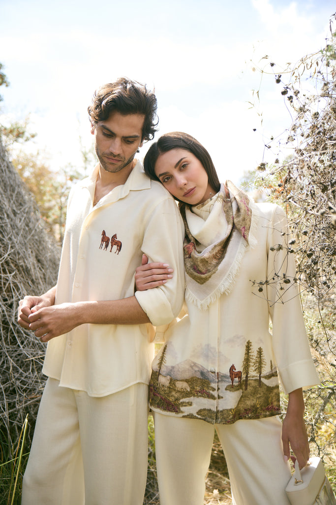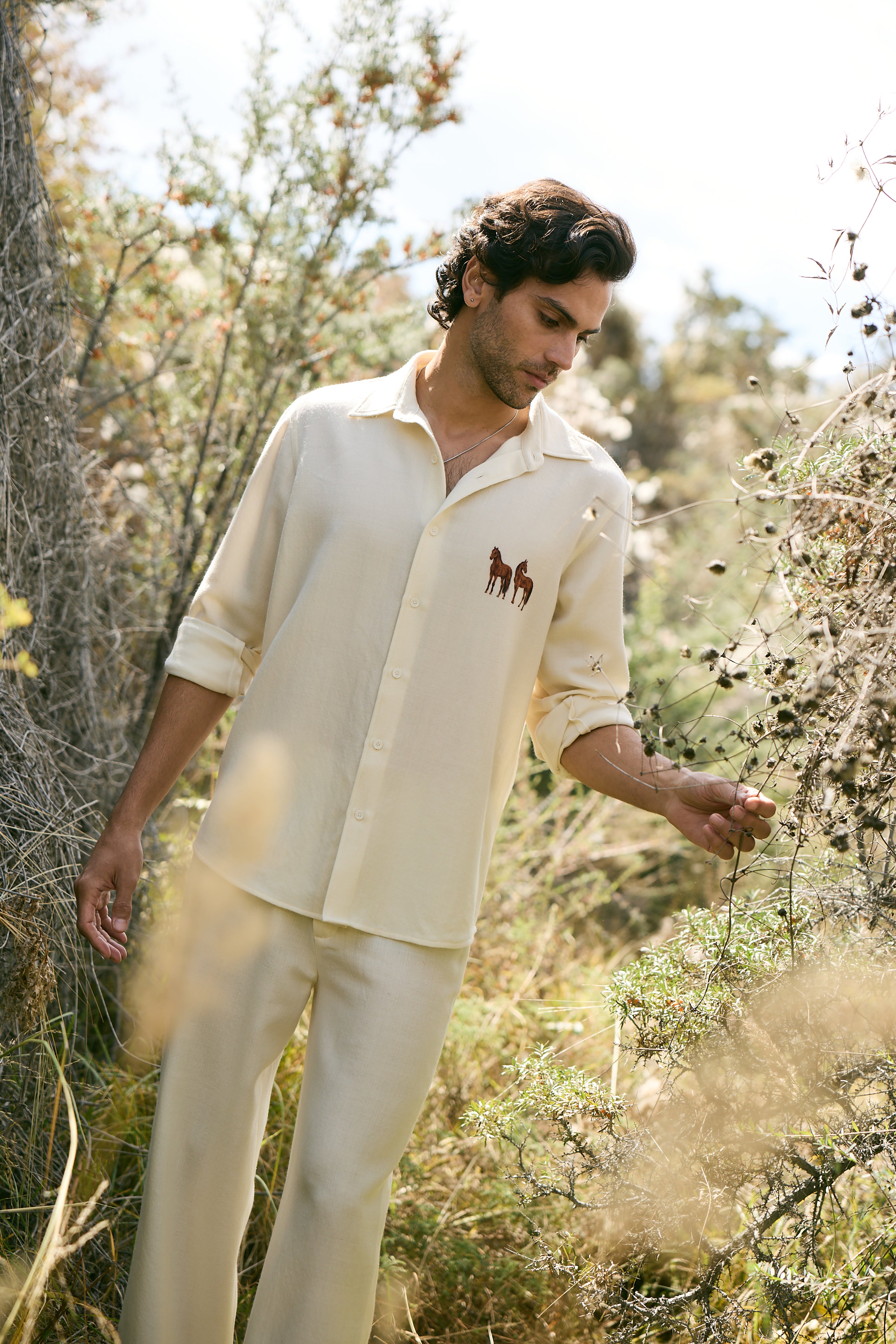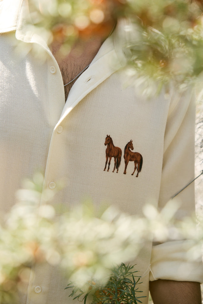 Crafted in ivory soft wool with a fine herringbone weave, this shirt redefines effortless sophistication with its clean lines and relaxed tailoring. The printed Himalayan horses on the chest add a distinctive detail, turning a classic piece into one with quiet presence and character.