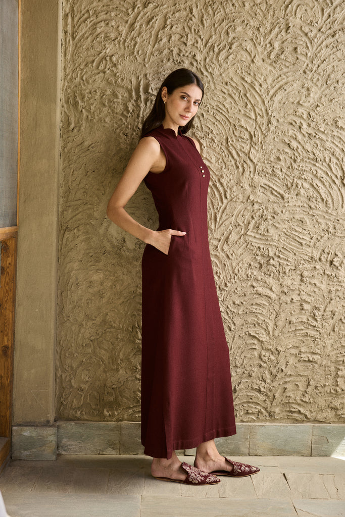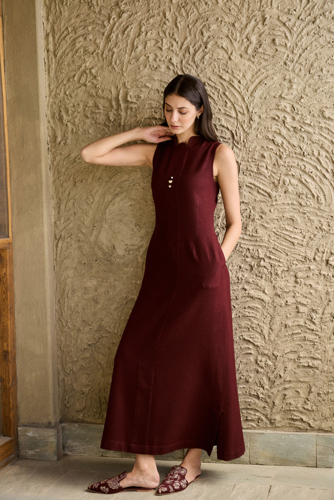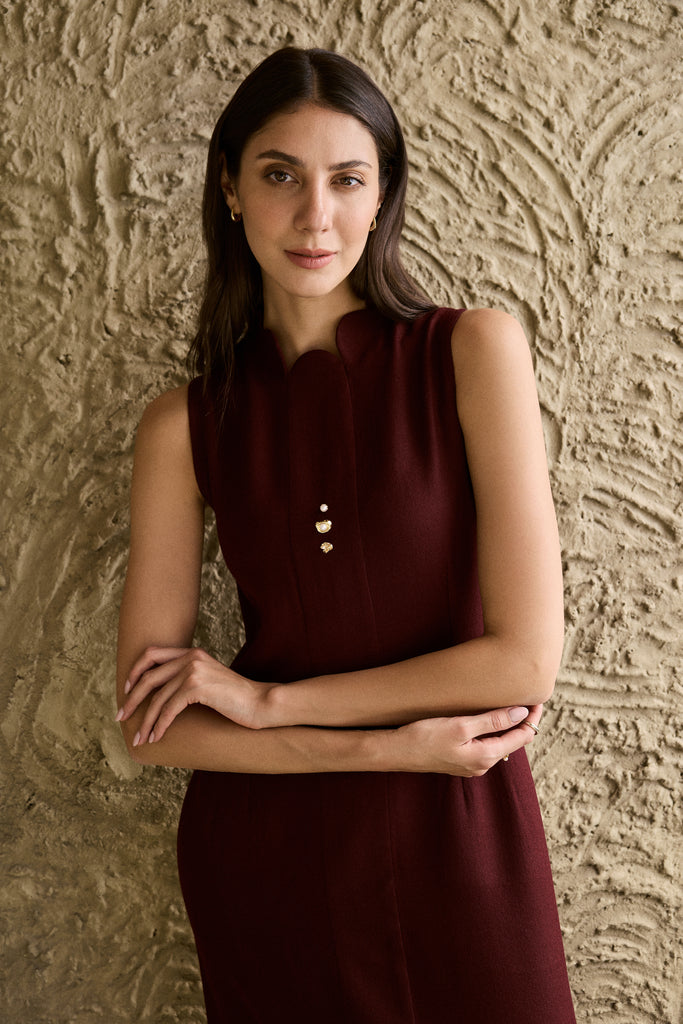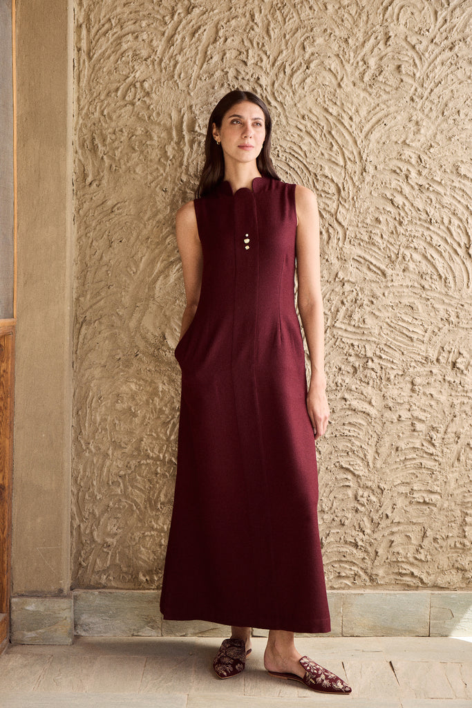 This sleeveless long dress in deep Merlot is tailored in an elongated silhouette that lengthens the frame with effortless grace. The neckline is designed with sculpted curves that frame the collar beautifully. At its center, a trio of stunning accessory buttons adds distinction, each one unique in design, texture, and detail, evoking the elegance of miniature brooches or jewelry. Clean vertical paneling and precision stitches create structure, while the concealed zip at the back ensures a smooth fit.