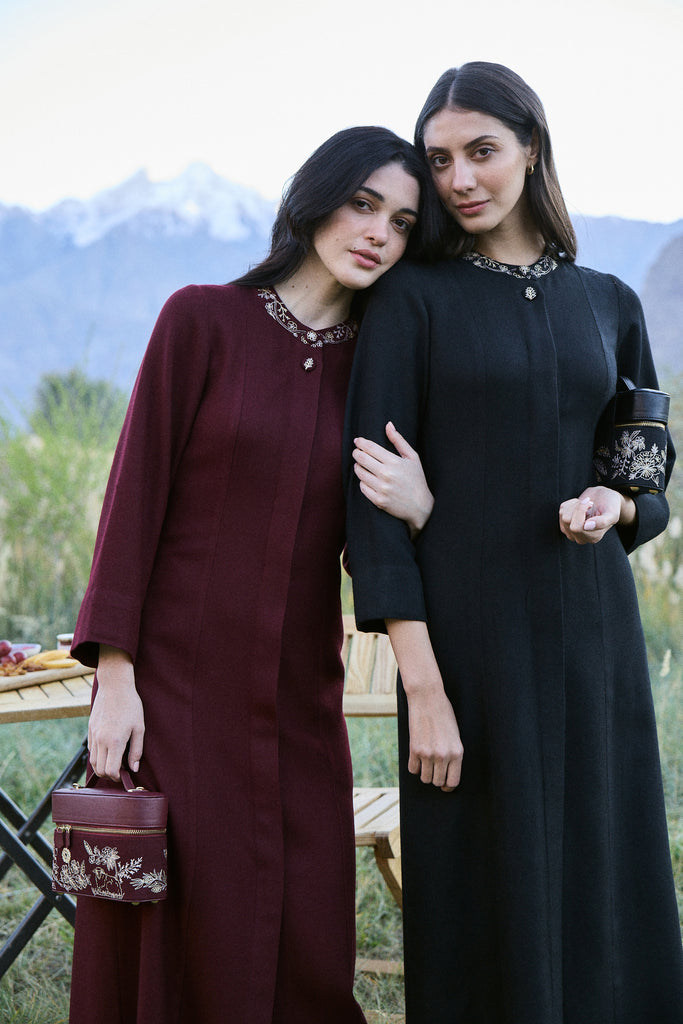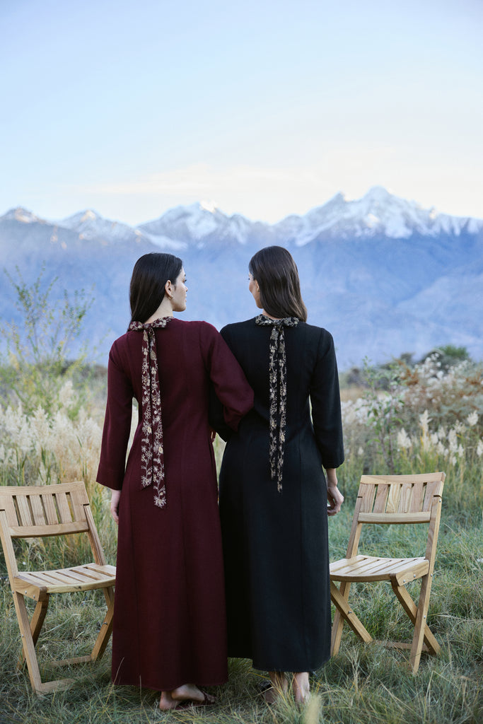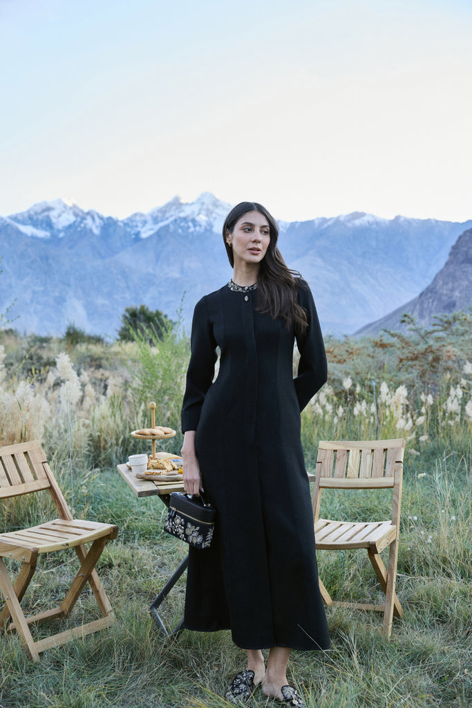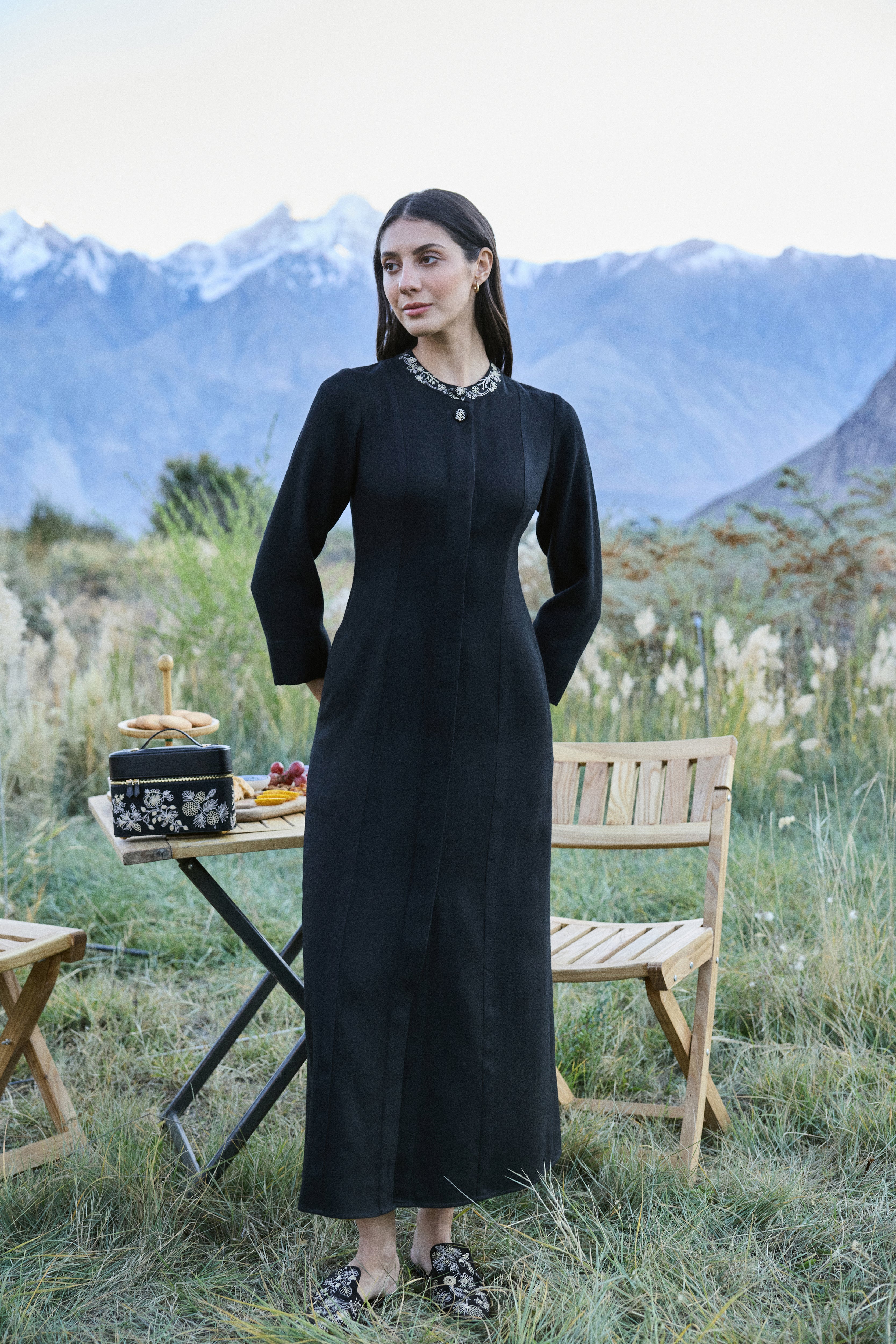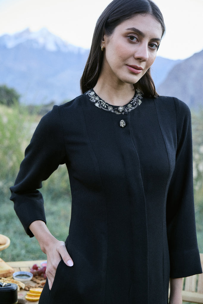 Crafted in soft wool, this long black dress is designed with versatile elegance- it can be worn on its own or styled as a jacket or overlay. The silhouette falls gracefully with structured seams and detailed stitches that enhance its fluid drape and refined tailoring. At the neckline, delicate valley-inspired florals are embroidered in faint metallic gold and silver threads, adding a subtle touch of luminosity. The dress is finished with embroidered buttons that blend seamlessly into the design, while the long sleeves and clean front panels emphasize its timeless sophistication.