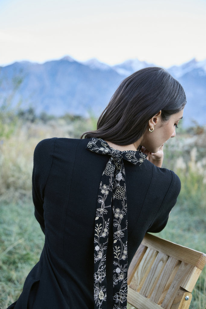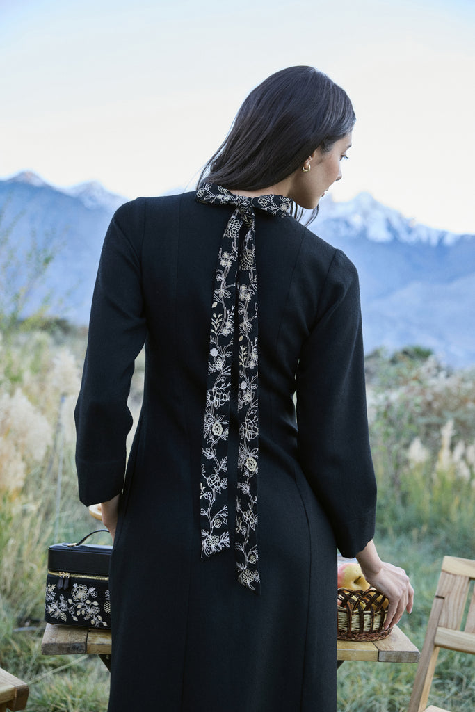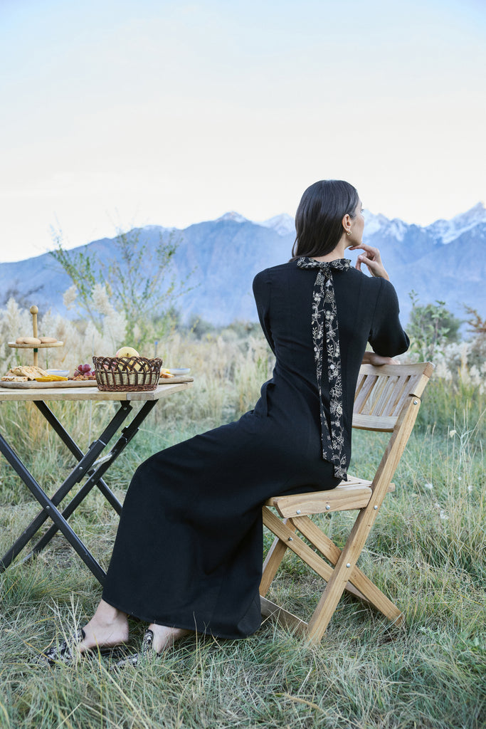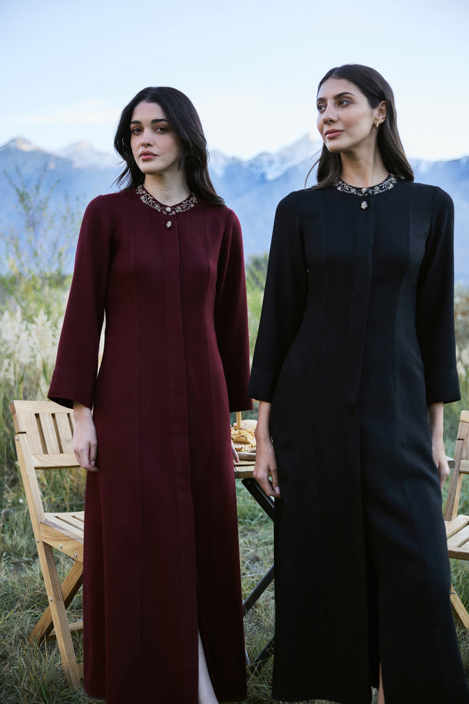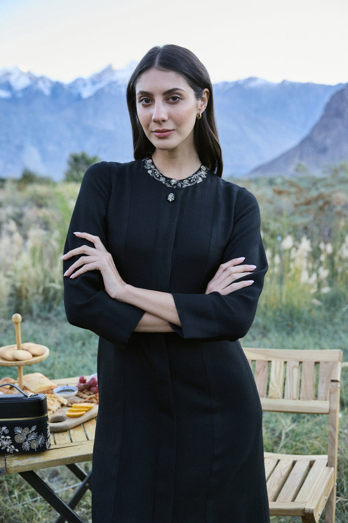 Crafted in soft wool, this long black dress is designed with versatile elegance- it can be worn on its own or styled as a jacket or overlay. The silhouette falls gracefully with structured seams and detailed stitches that enhance its fluid drape and refined tailoring. At the neckline, delicate valley-inspired florals are embroidered in faint metallic gold and silver threads, adding a subtle touch of luminosity. The dress is finished with embroidered buttons that blend seamlessly into the design, while the long sleeves and clean front panels emphasize its timeless sophistication.
