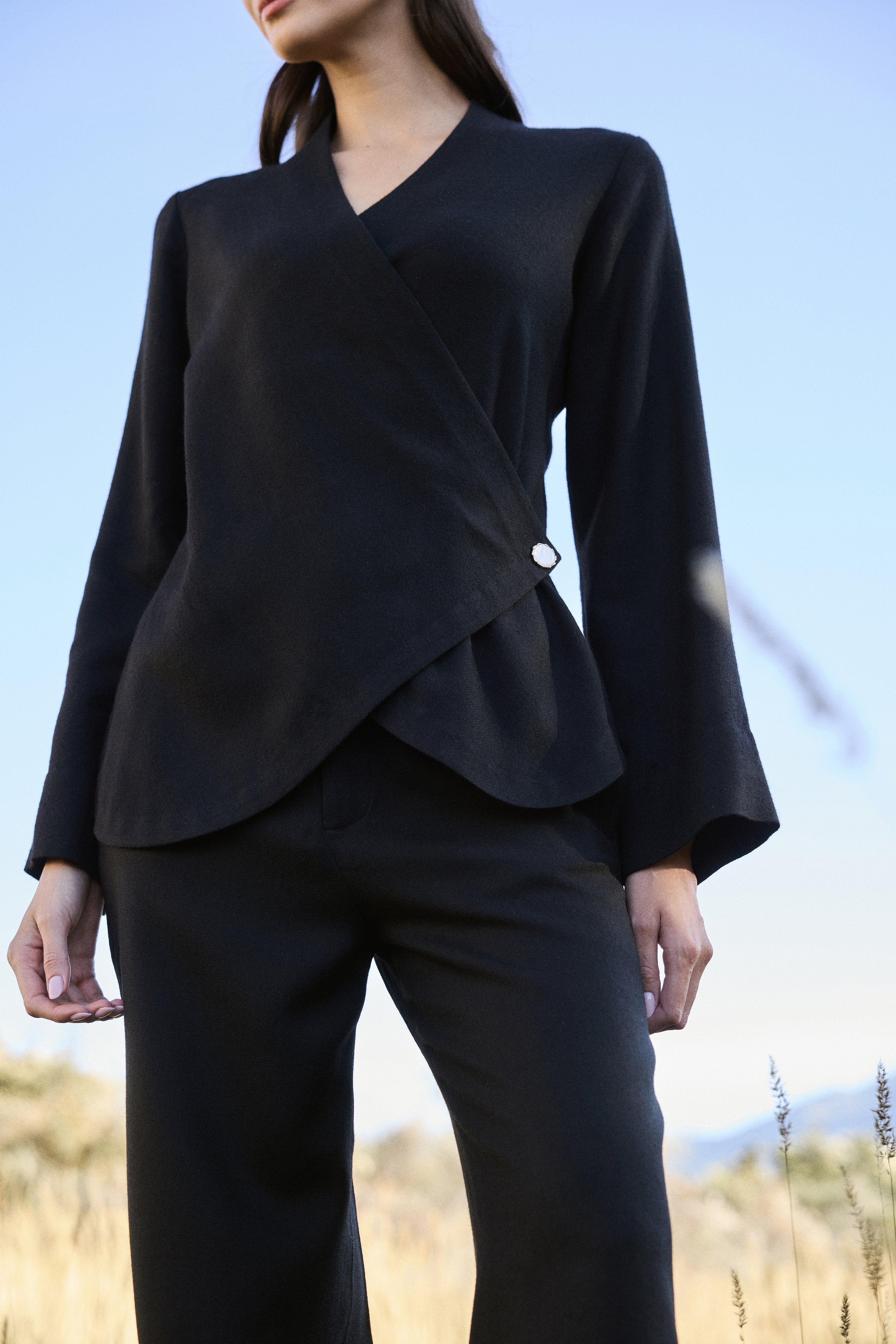 Crafted in soft wool, this wrap-style top drapes effortlessly with a fluid cross-front design that flatters the silhouette. The asymmetric hemline adds movement and ease, while a single mother-of-pearl inspired button secures the overlap at the side, lending it the look of a subtle accessory worked into the garment. Finished with long tailored sleeves and a clean V-neckline, it is a versatile piece that embodies understated elegance.
