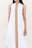 Relaxed soft linen, sleeveless dress with an insert panel of white dense linen detailing, in the front and back. The dress also has concealed waist drawstrings for fluidity in shape and size, along with side pockets.
