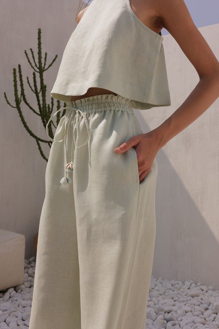 Malta Pants (Mint)-Soft, organic linen wide legged pants with expandable elastic waist for comfort and pockets. The waist of the pants have a drawstring with shell tassel detail, enhancing the simple silhouette of the pants. Click Here