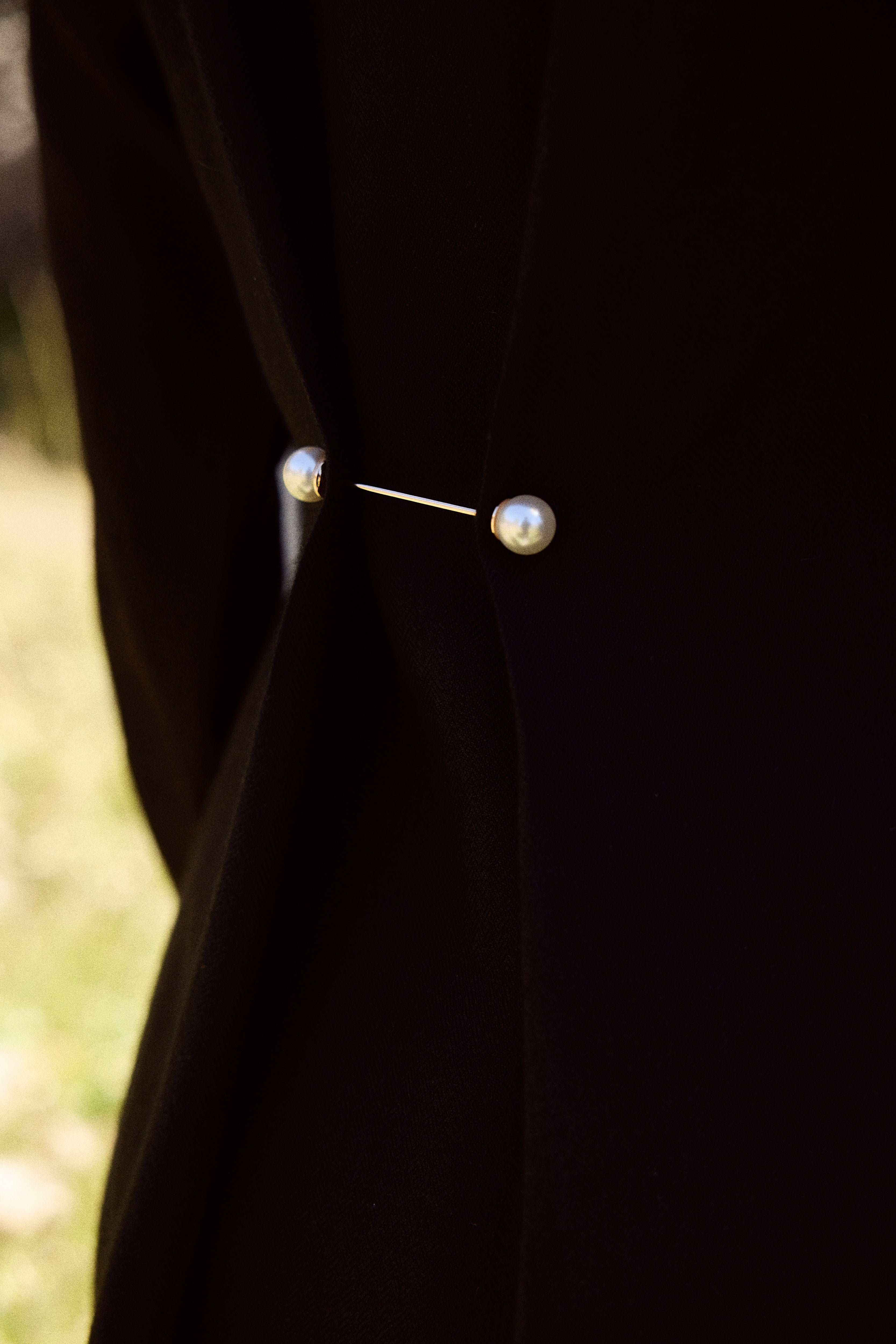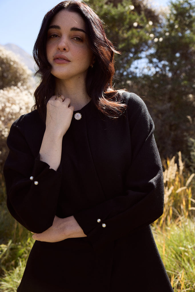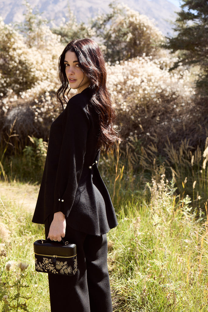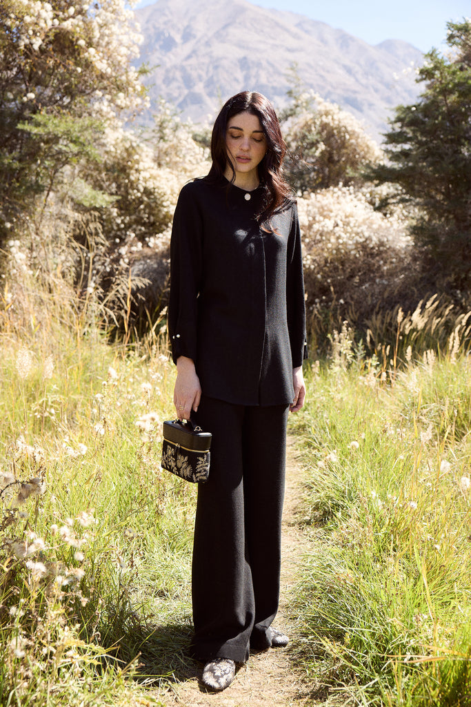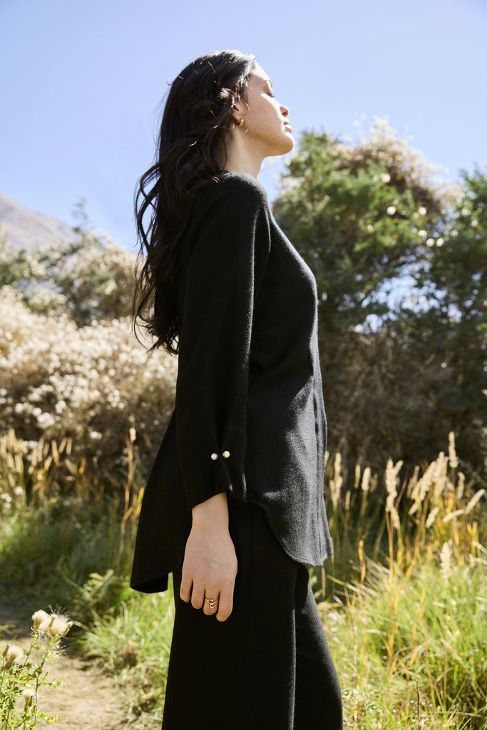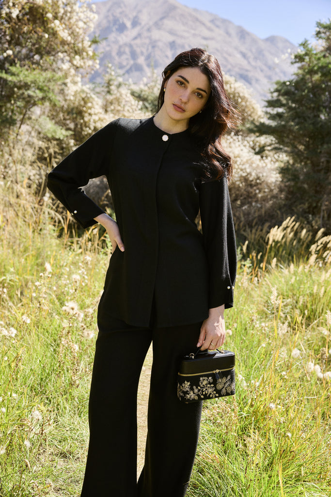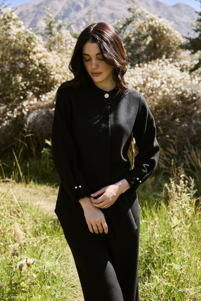 Laha Woollen Top (Black) - Crafted in soft, fine wool, this top is defined by its seamless collar and concealed placket, finished with a stunning accessory button at the neckline. The back is gathered with a beautiful pearl lapel pin, creating gentle pleats for subtle shape, while the sleeves are detailed with matching pearl pin closures at the cuffs.Click Here