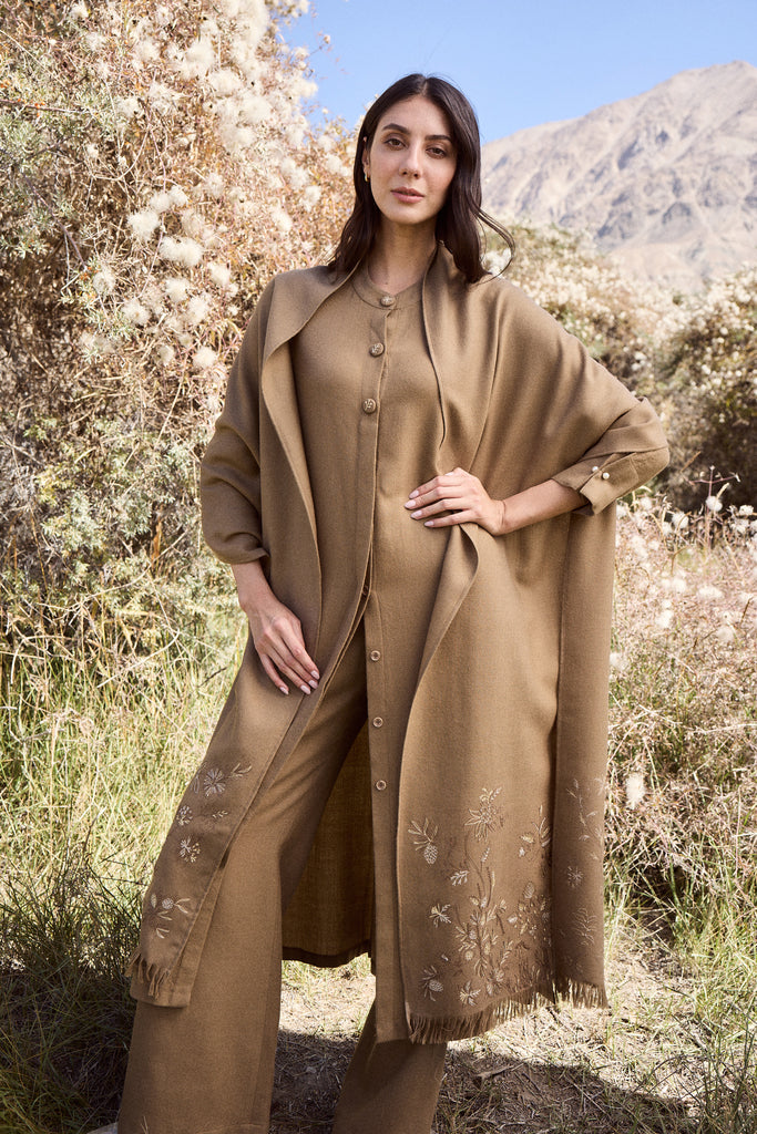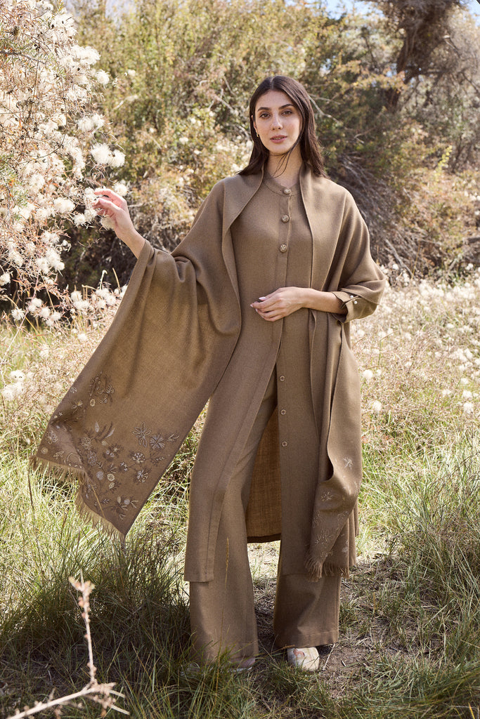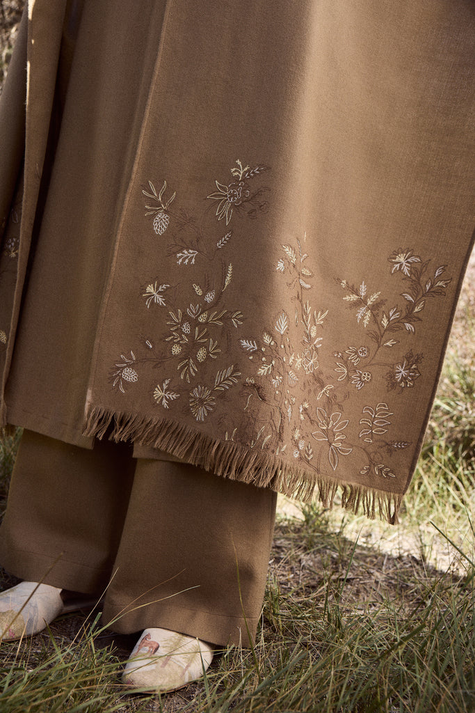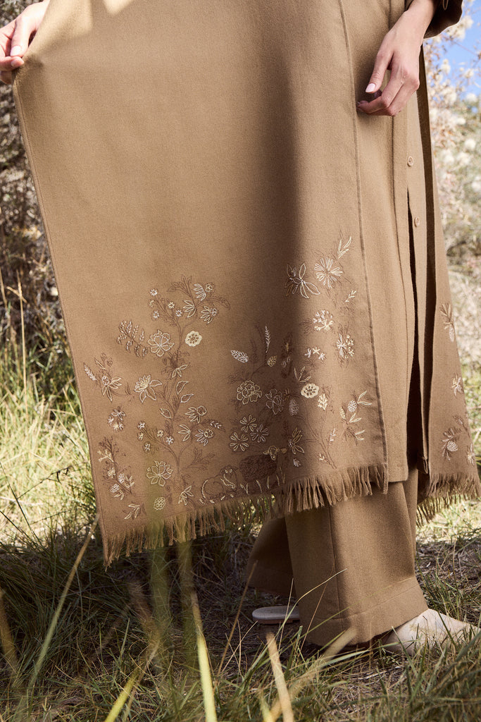 This shawl is crafted in soft wool in a rich Valley Clay hue, designed to envelop you in warmth and refinement. Its edges are adorned with delicate thread embroidery in faint gold tone, depicting valley florals that flow like hand-drawn sketches across the fabric. The finely fringed border adds a textural finish, balancing structure with softness.