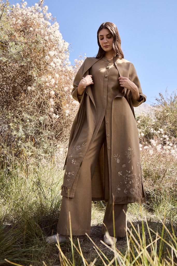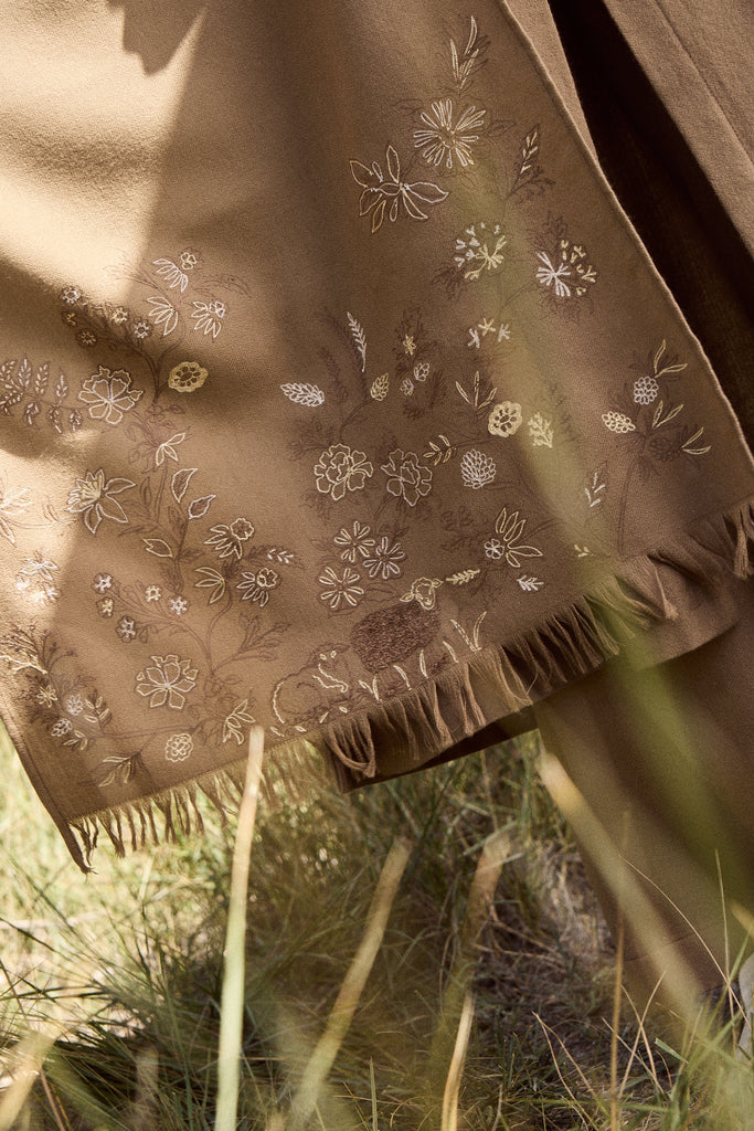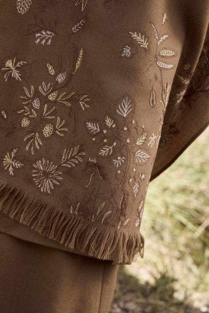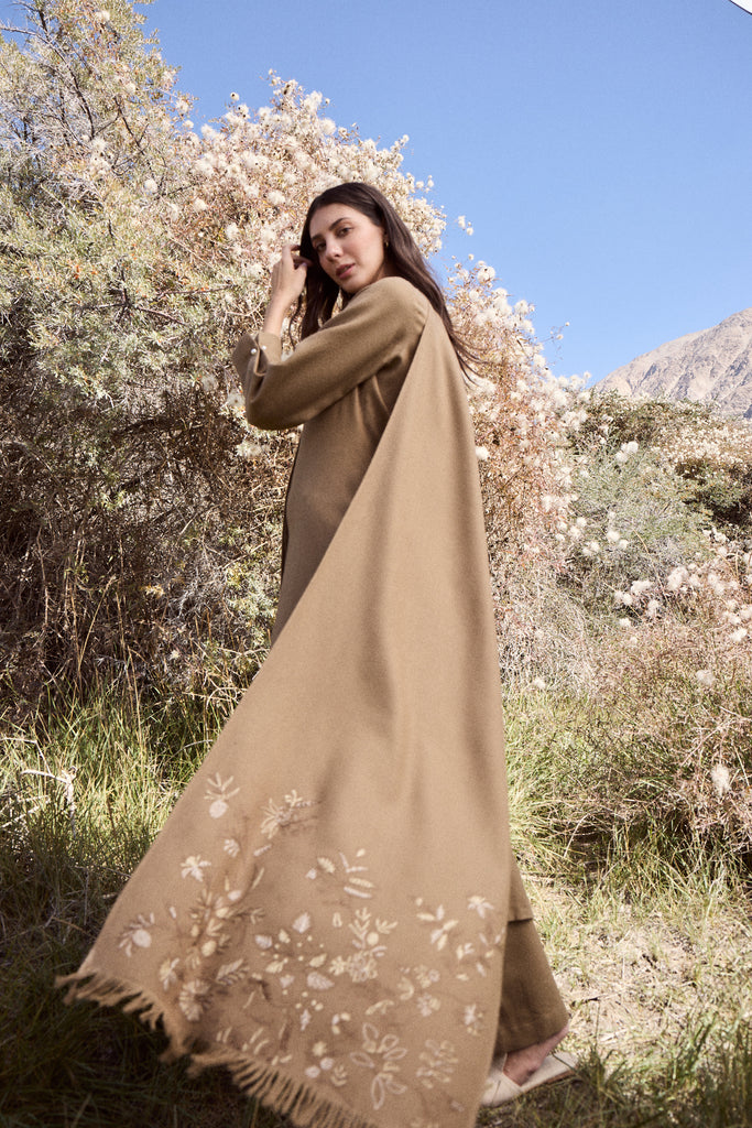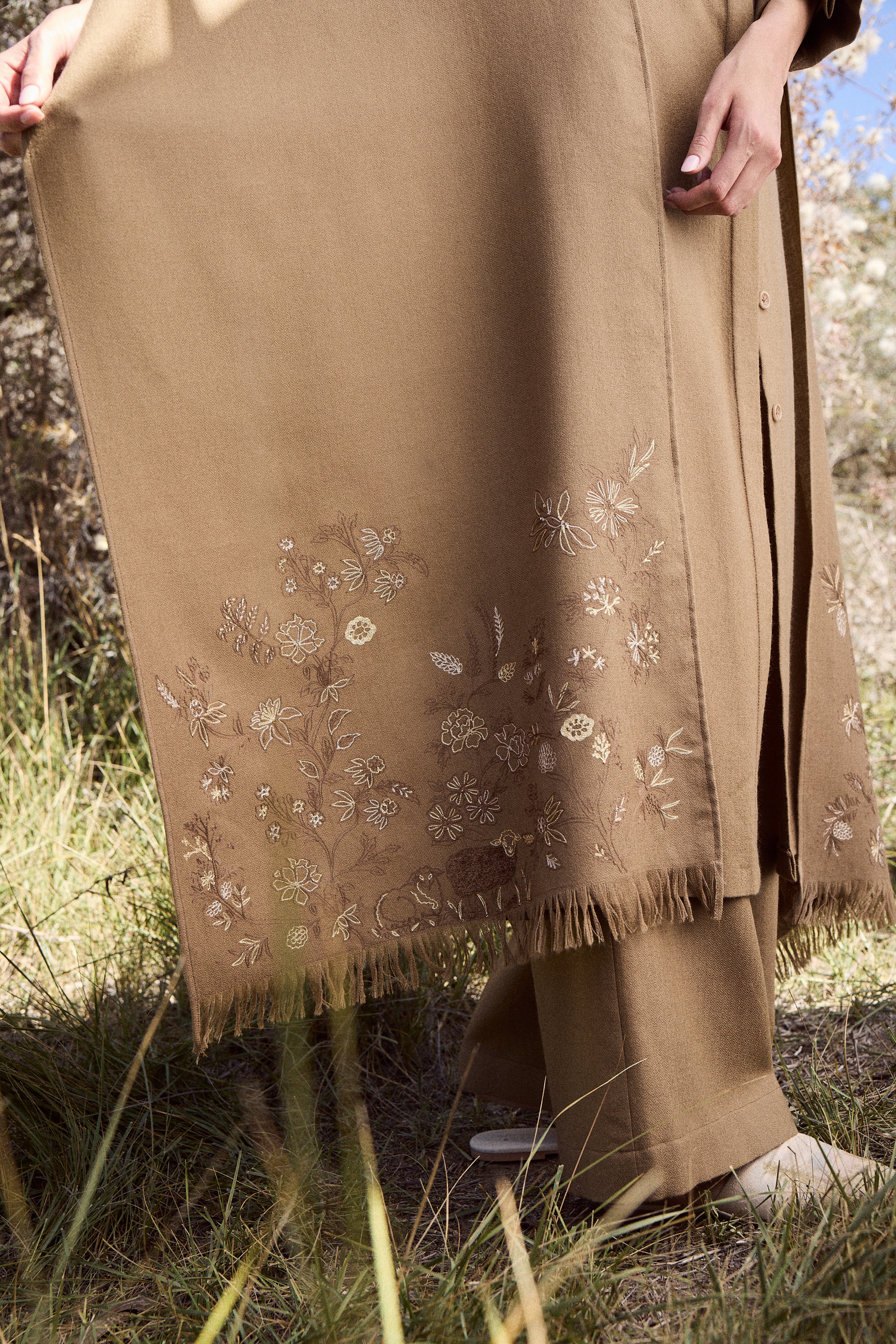 This shawl is crafted in soft wool in a rich Valley Clay hue, designed to envelop you in warmth and refinement. Its edges are adorned with delicate thread embroidery in faint gold tone, depicting valley florals that flow like hand-drawn sketches across the fabric. The finely fringed border adds a textural finish, balancing structure with softness.