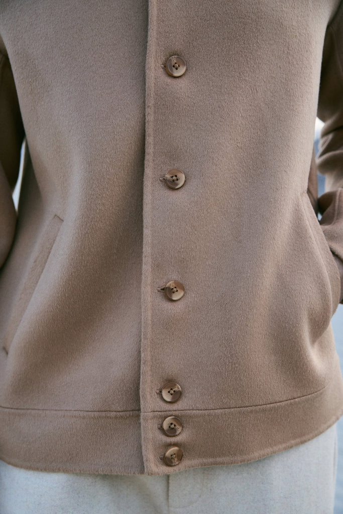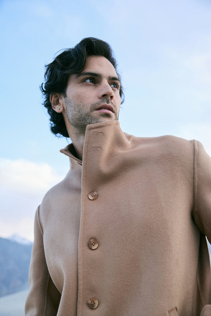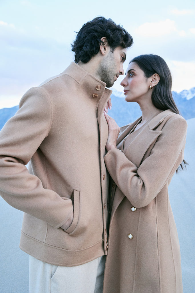 At the heart of this season lies our most luxurious fabric: a rare composition of 20% Cashmere, 60% Merino Wool, 10% Silk, and 10% Recycled Binding Fiber. Designed to carry you through the depths of winter with ease, the fabric combines the lofty softness of cashmere, the resilience of merino, and the lustrous drape of silk. Its construction is light as air yet intensely insulating, offering warmth without bulk. A dual-sided weave ensures that the same supple richness touches both skin and surface, while its fluid structure lends itself to precise tailoring and sculpted silhouettes. Elevated, enduring, and indulgent- this is outerwear at its most refined expression.