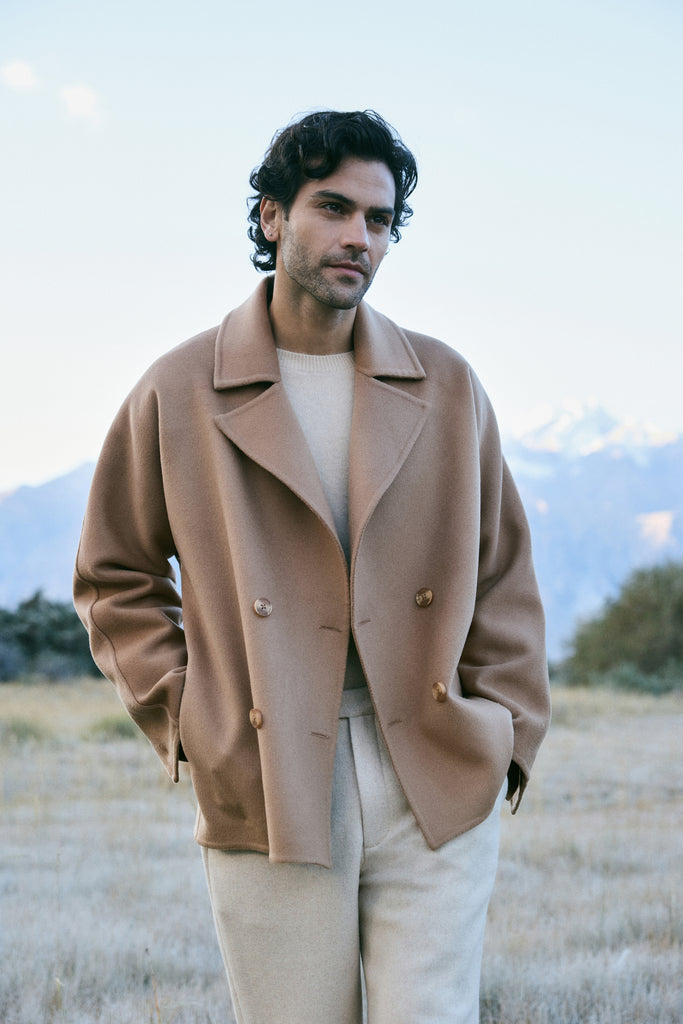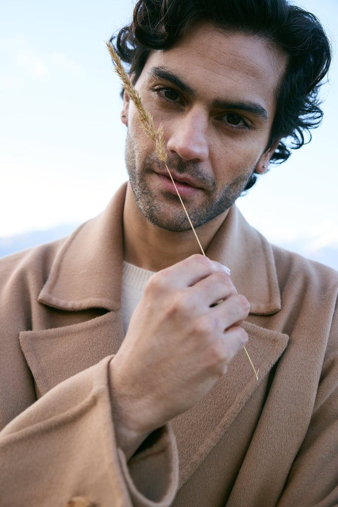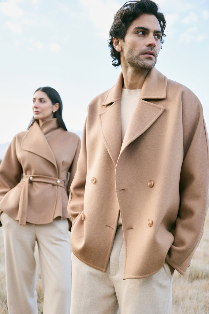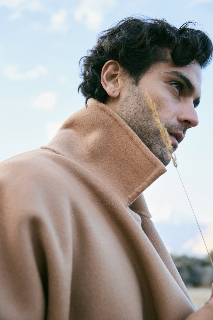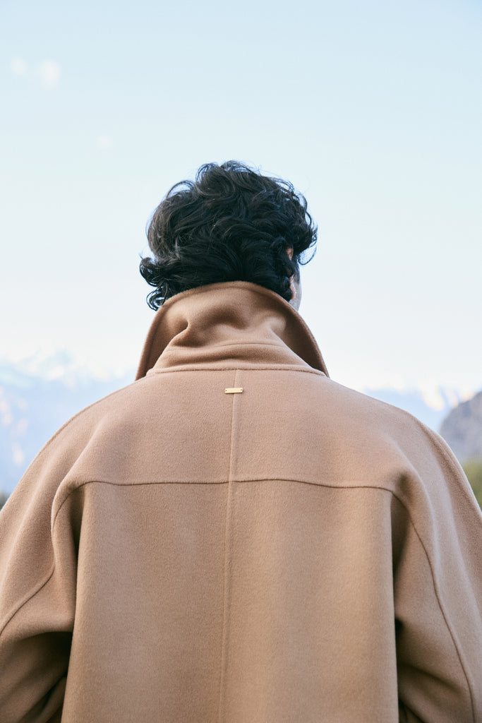 At the heart of this season lies our most luxurious fabric: a rare composition of 20% Cashmere, 60% Merino Wool, 10% Silk, and 10% Recycled Binding Fiber. Designed to carry you through the depths of winter with ease, the fabric combines the lofty softness of cashmere, the resilience of merino, and the lustrous drape of silk. Its construction is light as air yet intensely insulating, offering warmth without bulk. A dual-sided weave ensures that the same supple richness touches both skin and surface, while its fluid structure lends itself to precise tailoring and sculpted silhouettes. Elevated, enduring, and indulgent- this is outerwear at its most refined expression.