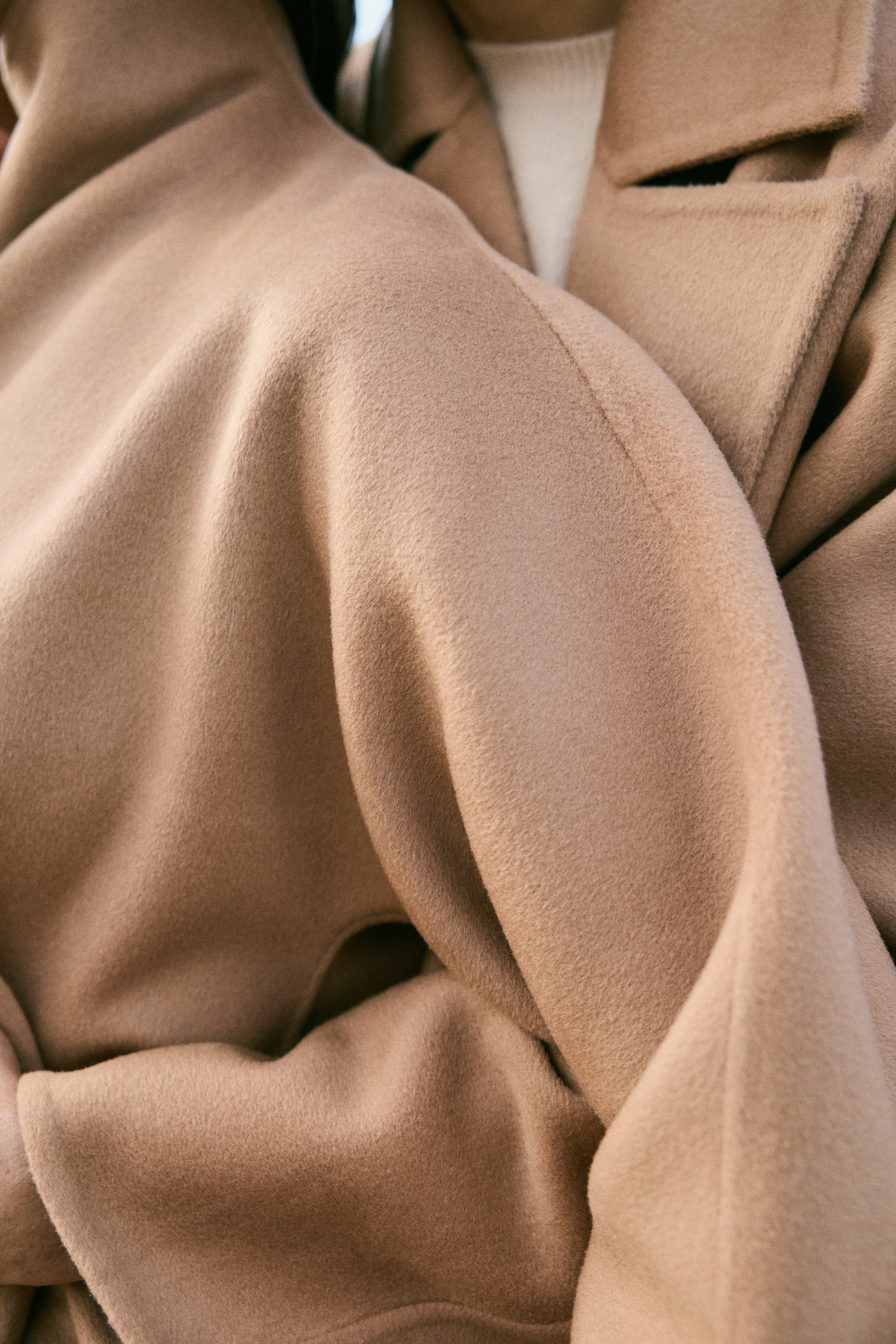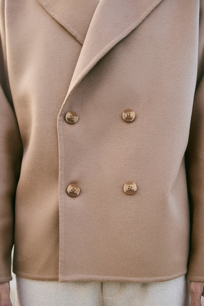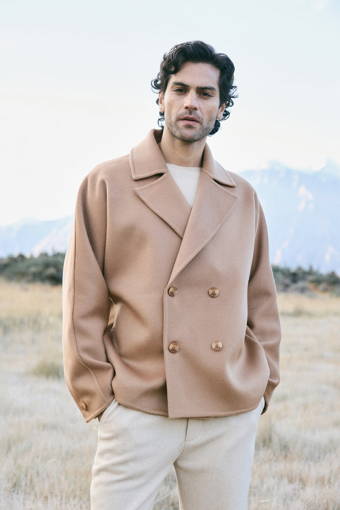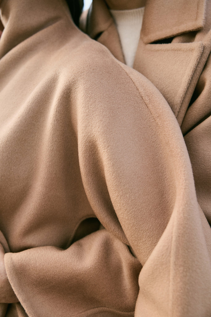 At the heart of this season lies our most luxurious fabric: a rare composition of 20% Cashmere, 60% Merino Wool, 10% Silk, and 10% Recycled Binding Fiber. Designed to carry you through the depths of winter with ease, the fabric combines the lofty softness of cashmere, the resilience of merino, and the lustrous drape of silk. Its construction is light as air yet intensely insulating, offering warmth without bulk. A dual-sided weave ensures that the same supple richness touches both skin and surface, while its fluid structure lends itself to precise tailoring and sculpted silhouettes. Elevated, enduring, and indulgent- this is outerwear at its most refined expression.