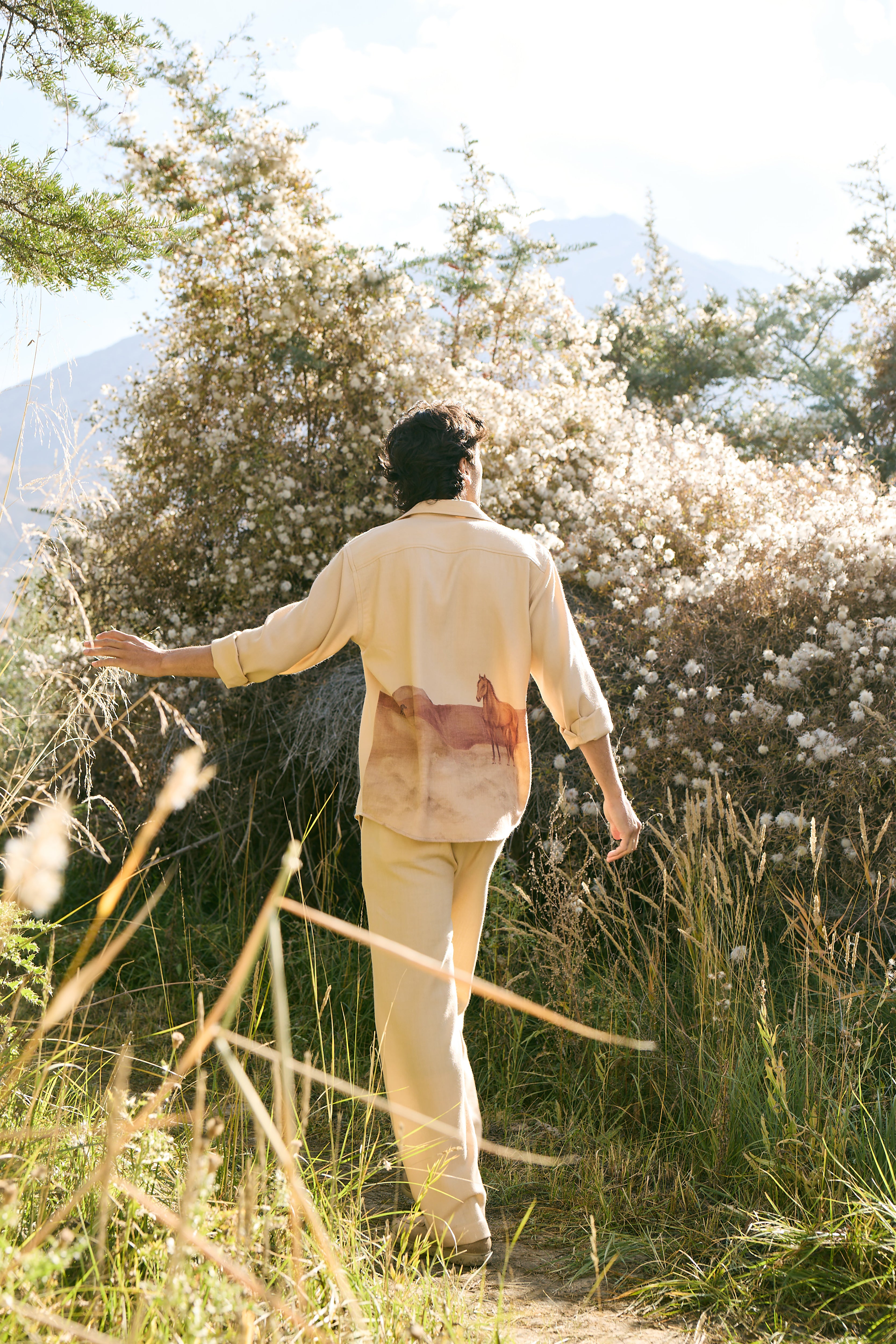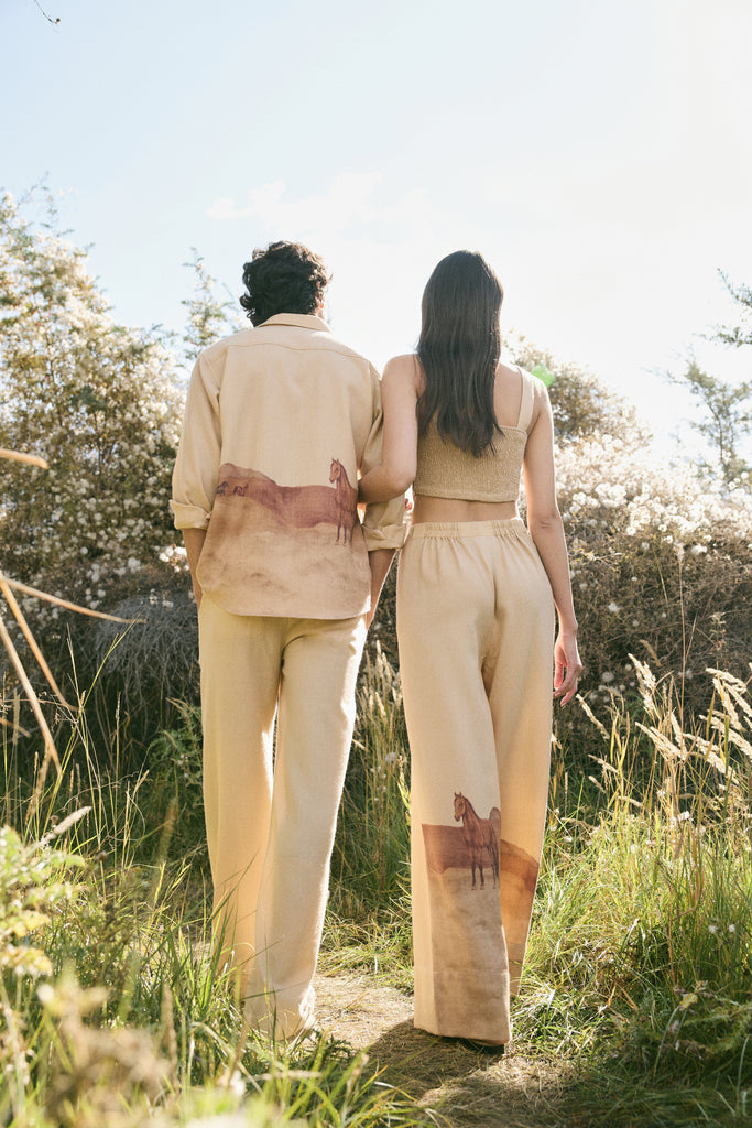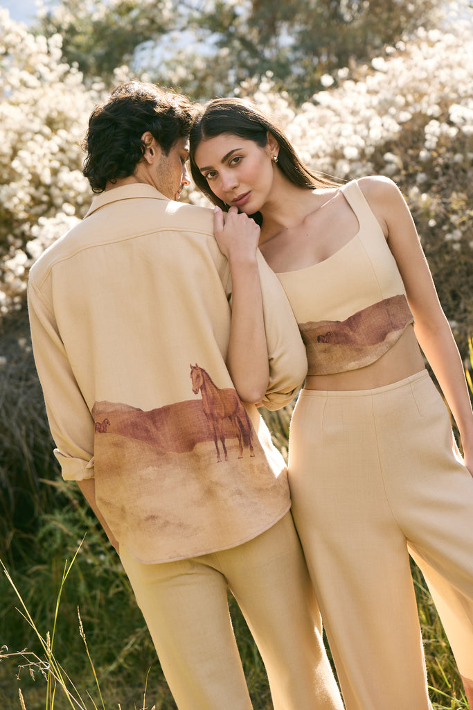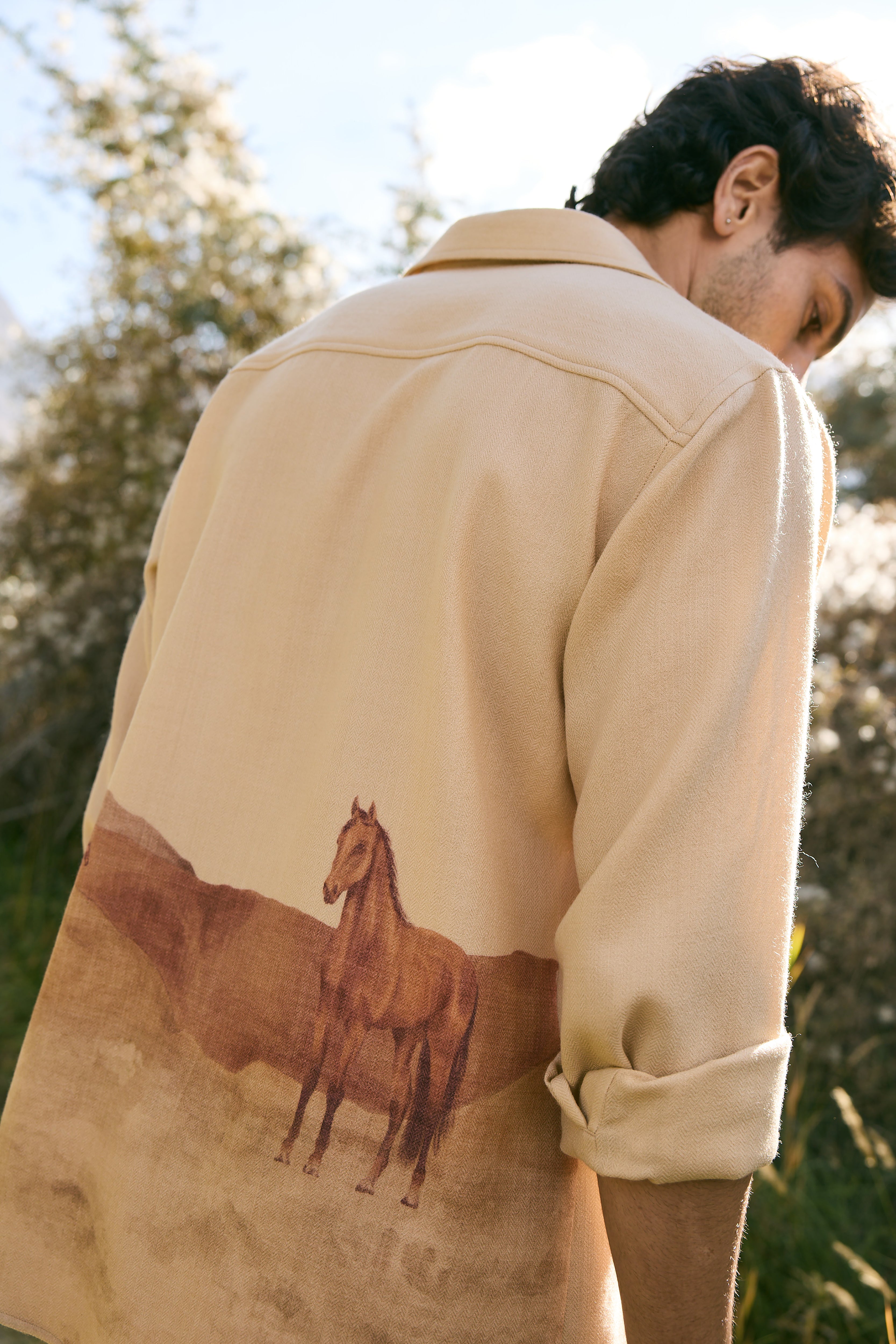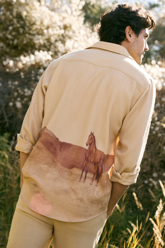 Valley Print Woollen Shirt - MAN (Himalyan Sand) - This Himalayan Sand shirt blends a tailored yet relaxed silhouette with an evocative valley print on the back, where horses move across painted landscapes. Crafted in lightweight natural soft wool with a subtle herringbone finish, it is more than a shirt, it is a canvas of The Lost Valley, reimagined as modern attire. Designed for the discerning eye, it makes a statement of artful elegance.Click Here