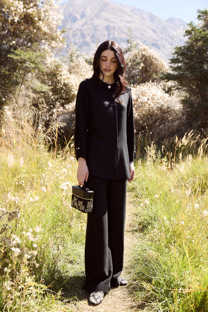 These Black Pants, tailored in soft wool with a fluid wide-leg silhouette, are elevated with a mother-of-pearl inspired accent button for a refined finish.