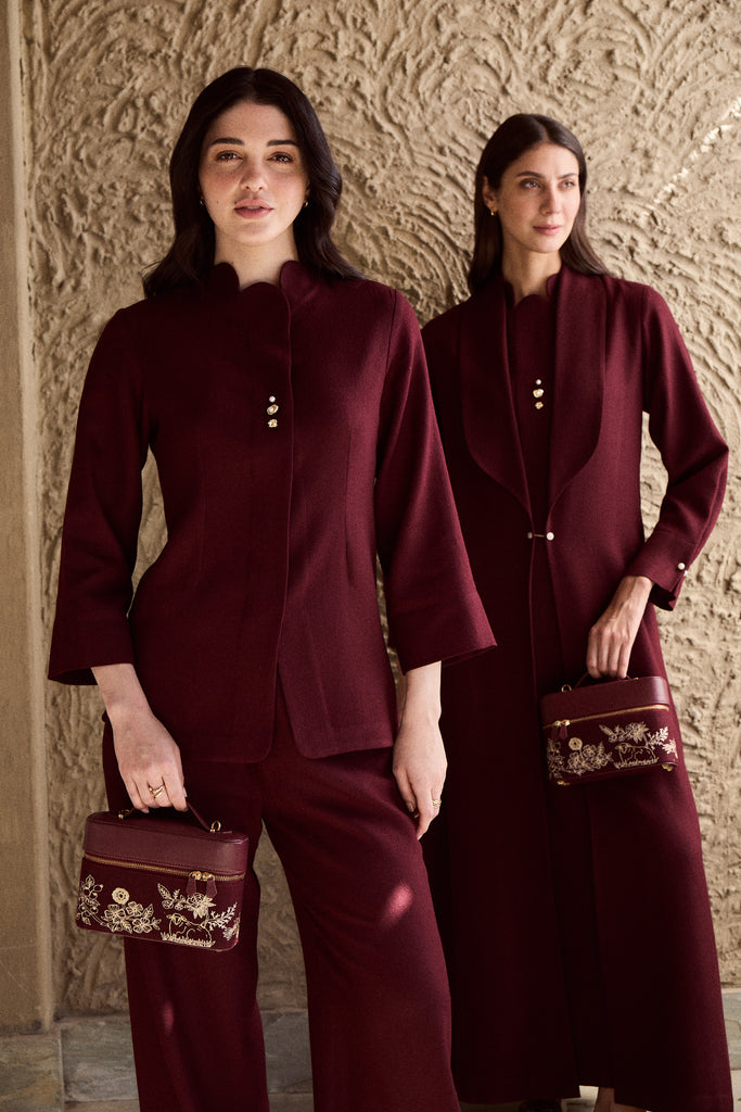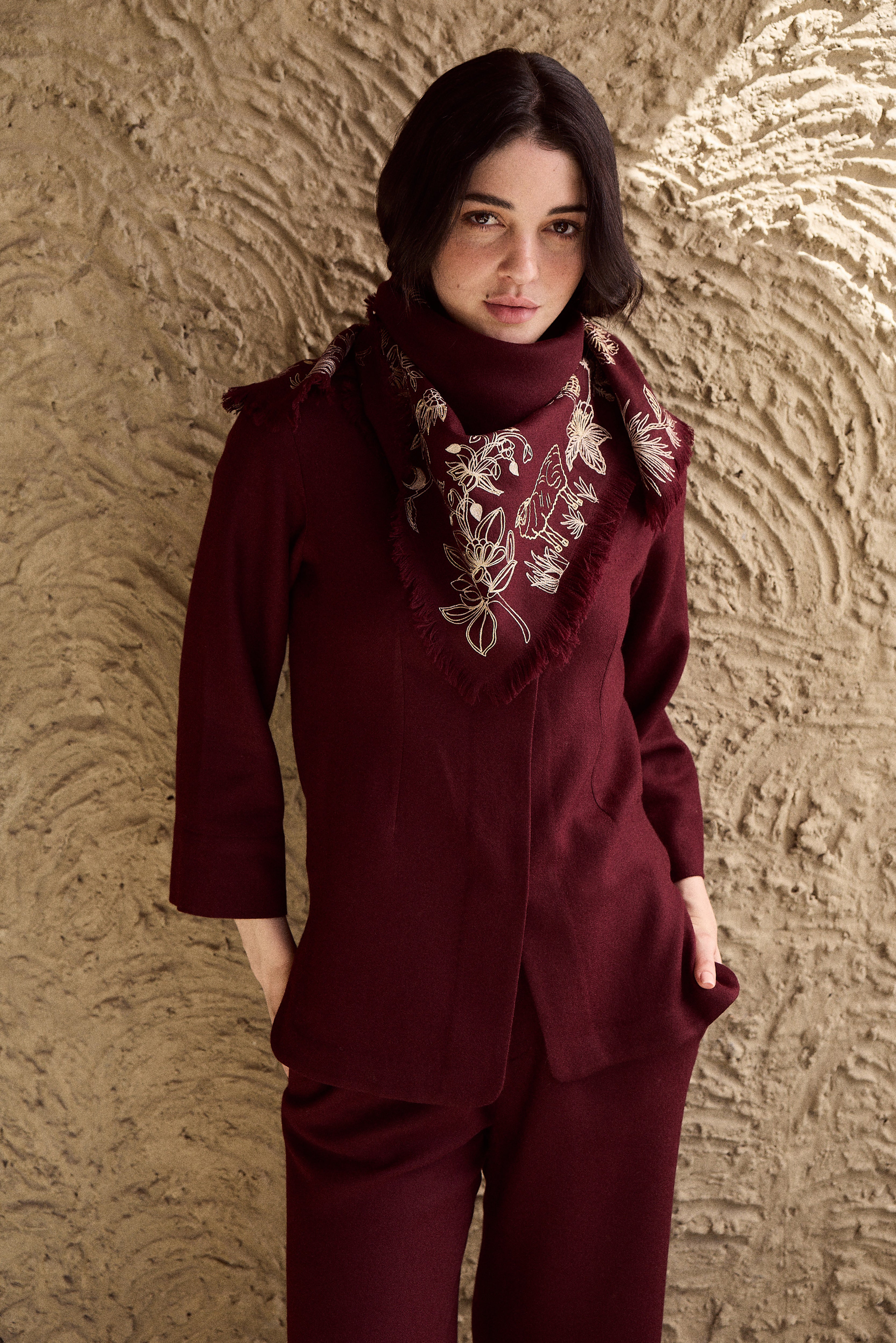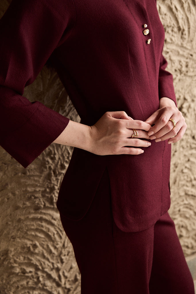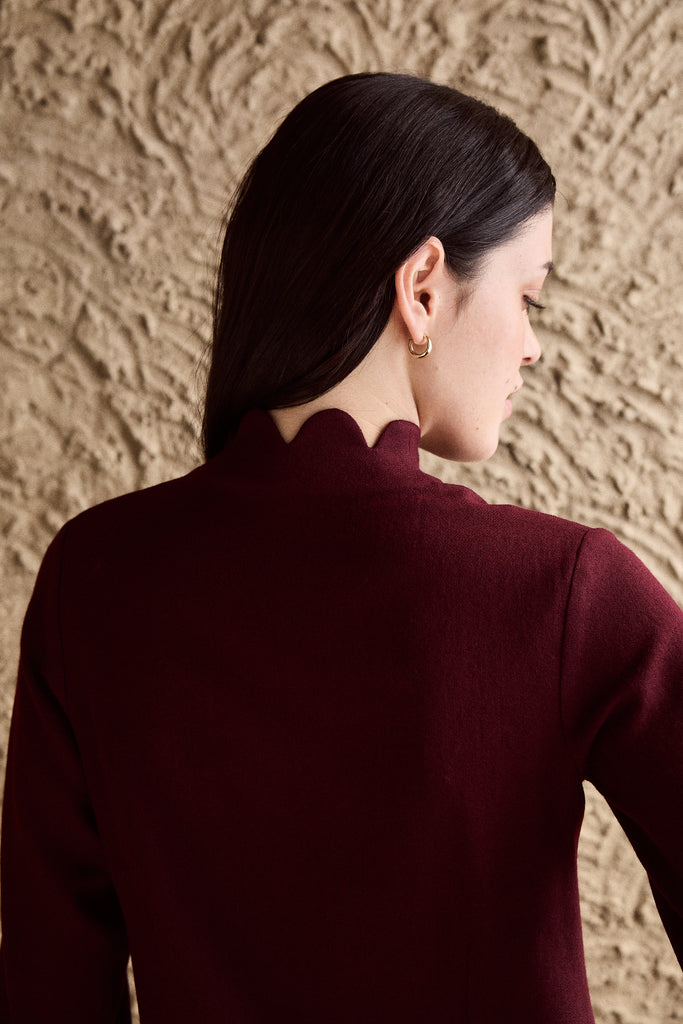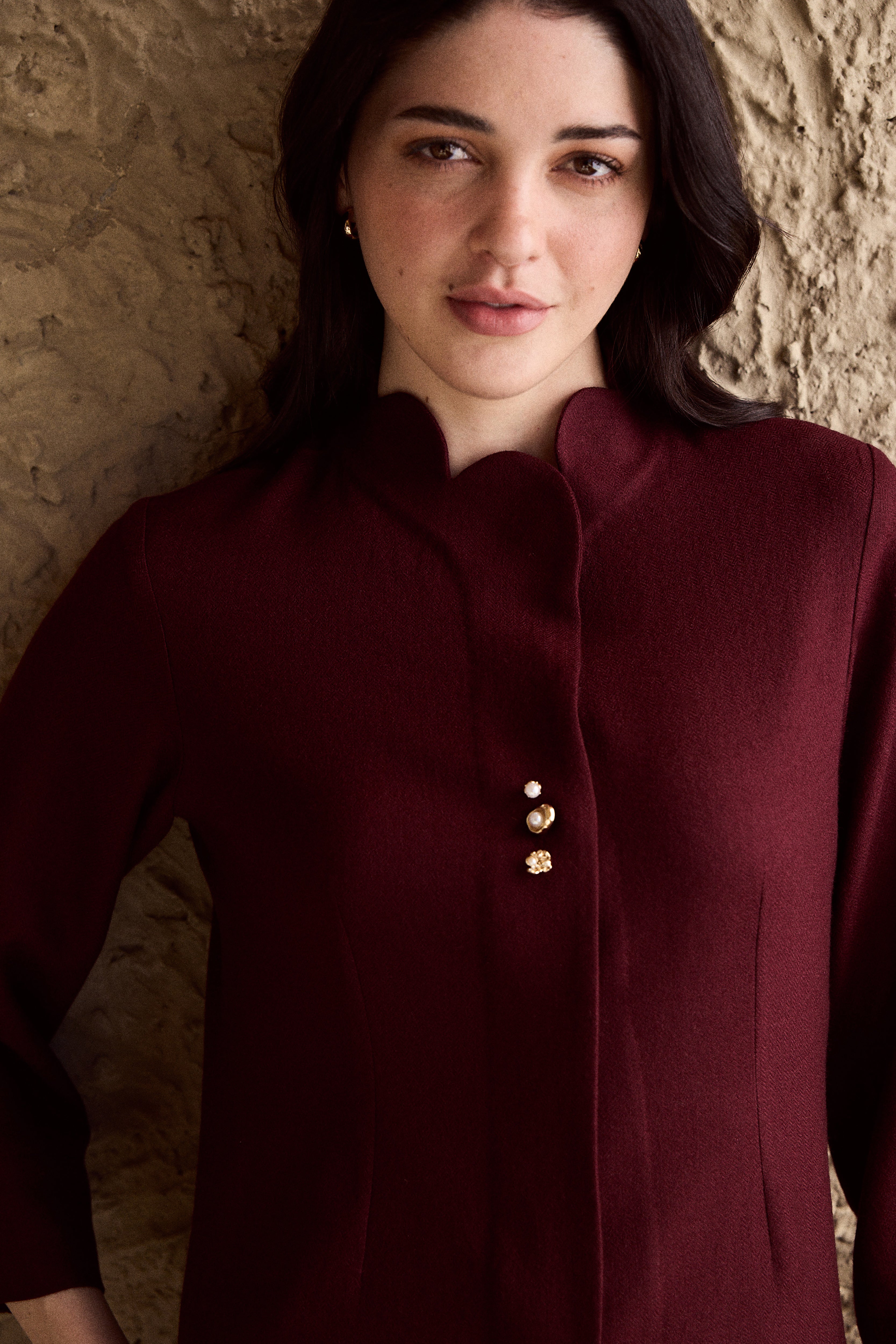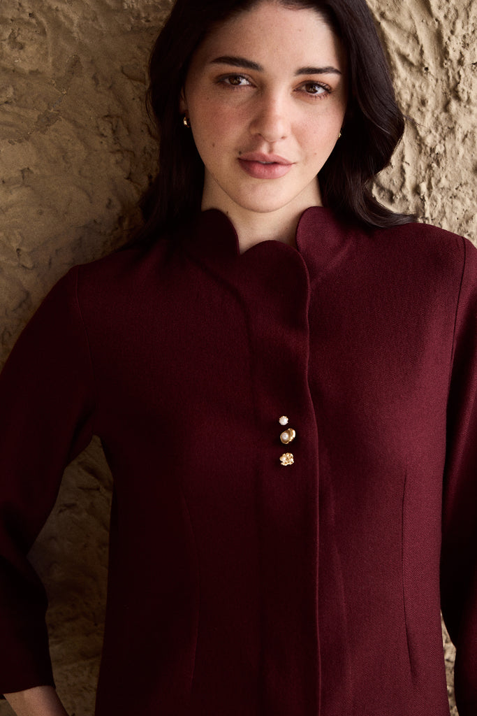 Tailored in soft wool in our seasonal shade of Merlot, this top features a sculpted scallop collar and a concealed placket, brought to life with a trio of stunning accessory buttons. Each button is unique in design, texture, and style, evoking the feel of a delicate brooch or a piece of jewellery woven into your clothing. The clean back and gently flared sleeves create fluid movement, while the silhouette flatters with subtle ease.
