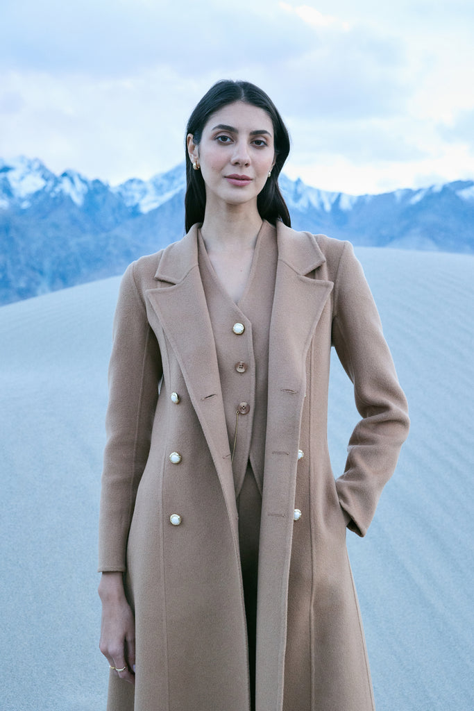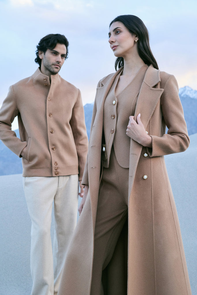 At the heart of this season lies our most luxurious fabric: a rare composition of 20% Cashmere, 60% Merino Wool, 10% Silk, and 10% Recycled Binding Fiber. Designed to carry you through the depths of winter with ease, the fabric combines the lofty softness of cashmere, the resilience of merino, and the lustrous drape of silk. Its construction is light as air yet intensely insulating, offering warmth without bulk. A dual-sided weave ensures that the same supple richness touches both skin and surface, while its fluid structure lends itself to precise tailoring and sculpted silhouettes. Elevated, enduring, and indulgent- this is outerwear at its most refined expression.