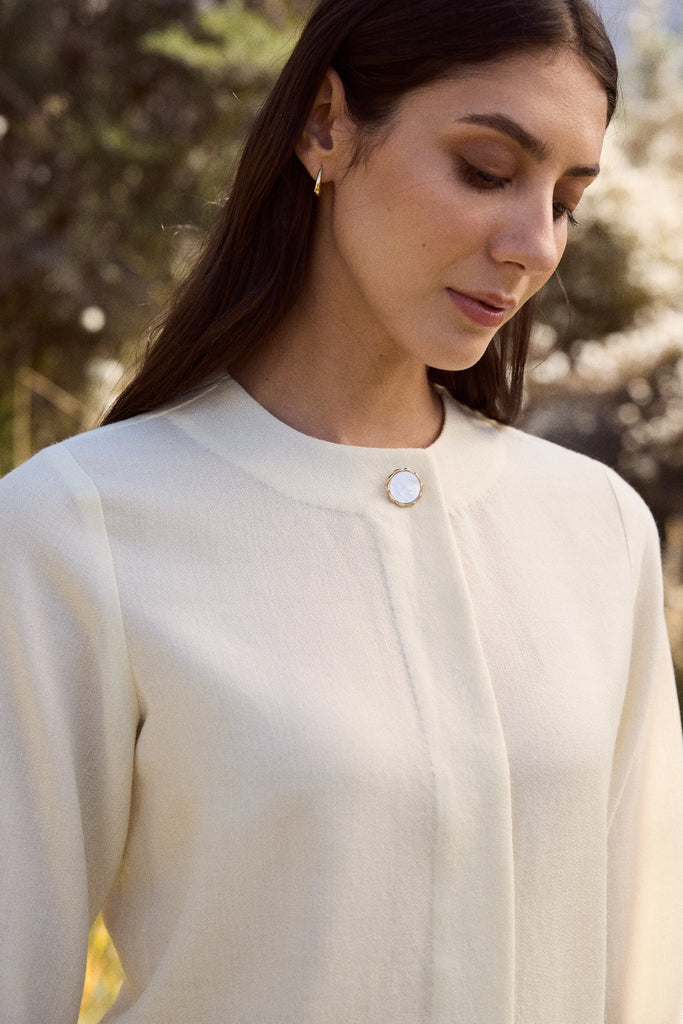 Crafted in soft, fine wool, this top is defined by its seamless collar and concealed placket, finished with a stunning accessory button at the neckline. The back is gathered with a beautiful pearl lapel pin, creating gentle pleats for subtle shape, while the sleeves are detailed with matching pearl pin closures at the cuffs.