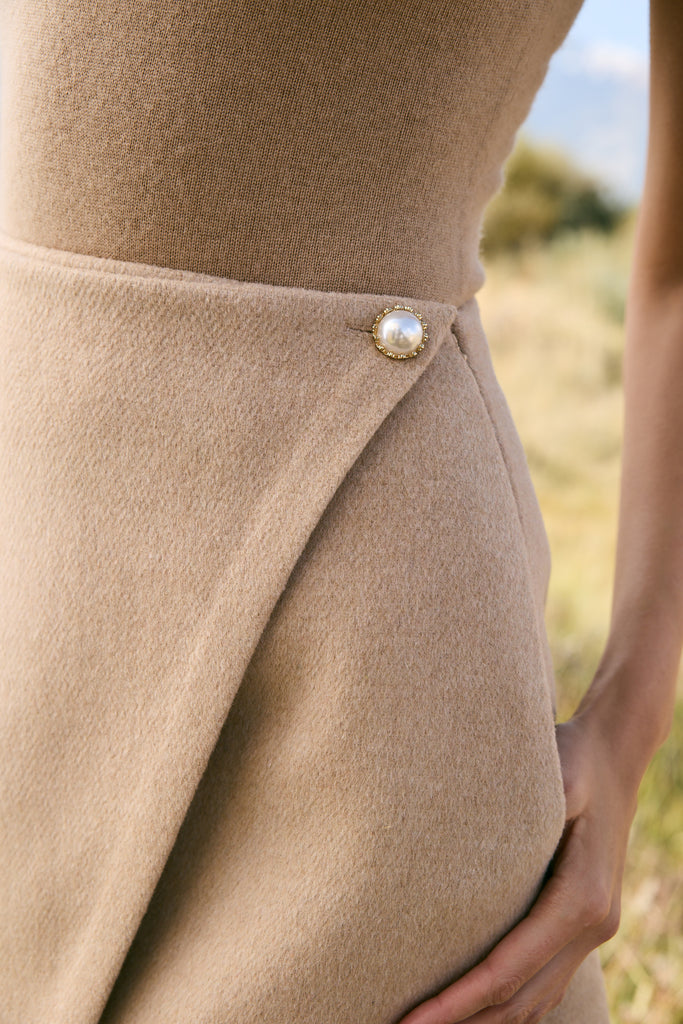 This short skirt is designed in a wrap-inspired silhouette, giving the visual appeal of a wrap without the functionality. A jewel-like stainless steel button in crowned pearl highlights the waist, adding an elegant touch.