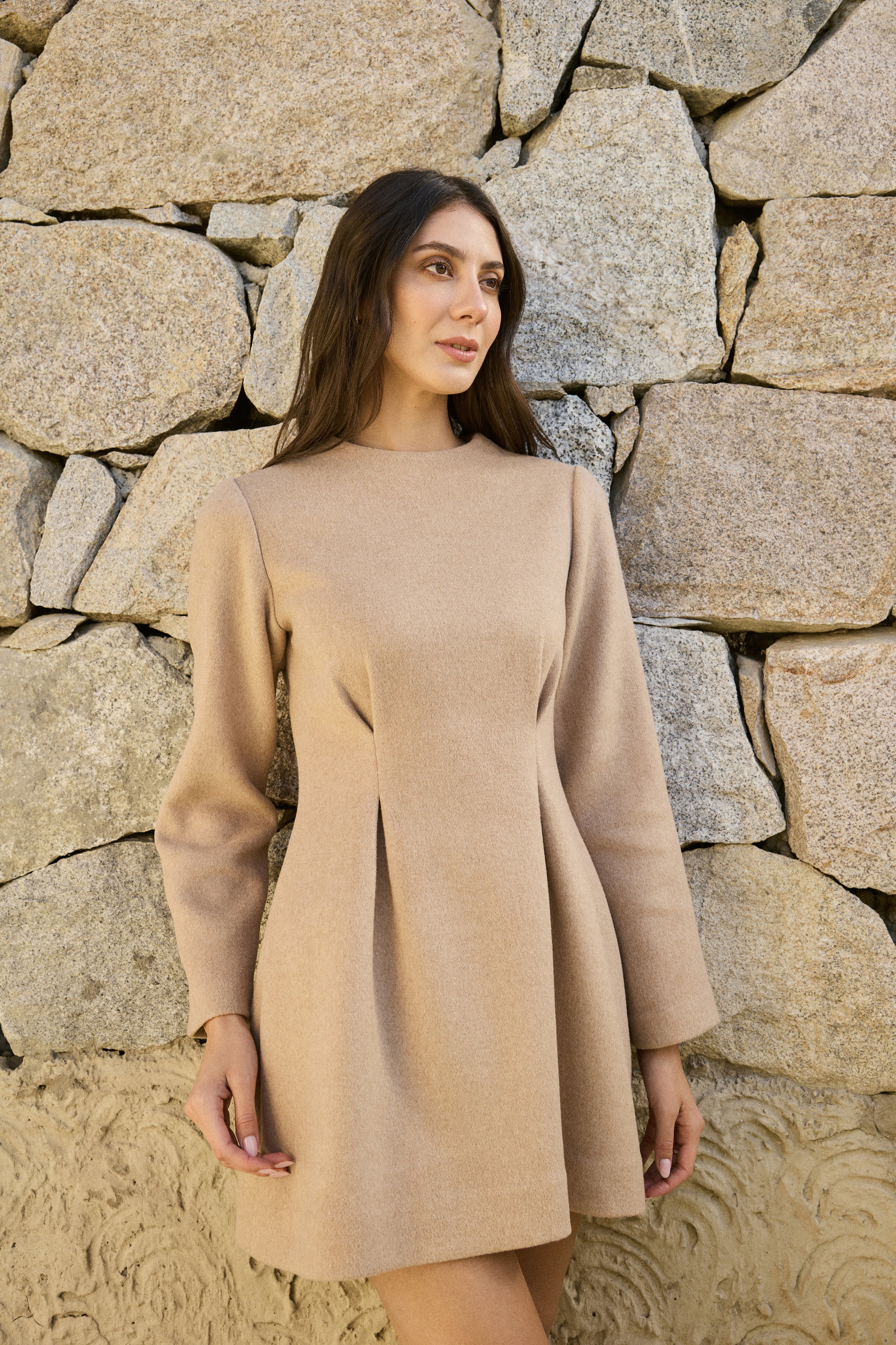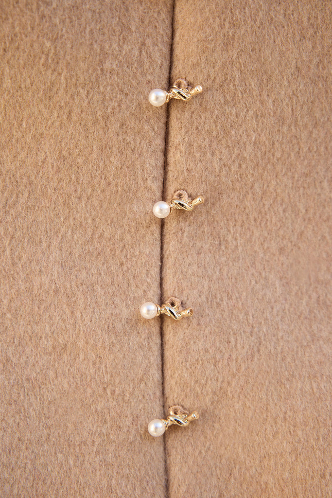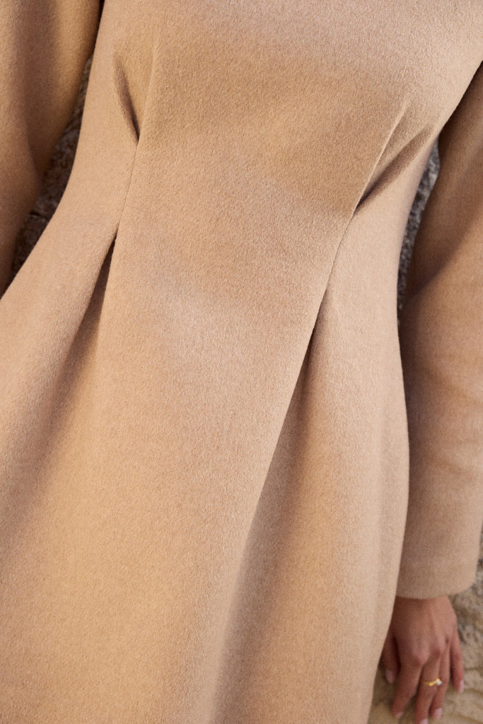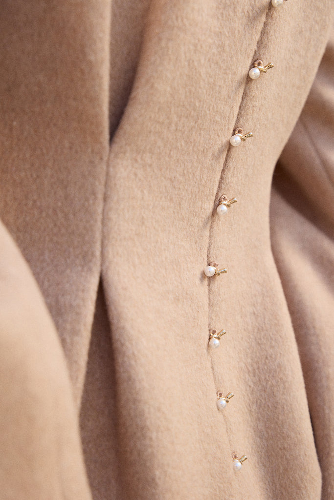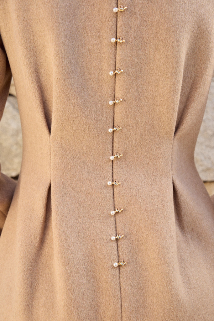 This dress is crafted in a structured yet feminine silhouette with sculpted pleats at the waist, giving it a cinched elegance and a graceful fall. At the back, a striking spine-inspired detail becomes the focal point—rows of pearl and gold-toned accents trace the line of the body like a jeweled vertebrae. These accents are non-functional, with a concealed zipper placed beneath for seamless wear, allowing the spine to remain uninterrupted. A piece that celebrates both strength and refinement, it transforms the back into a statement of sculptural beauty.
