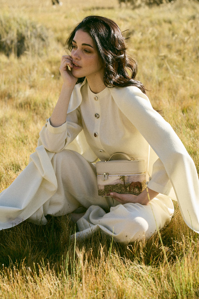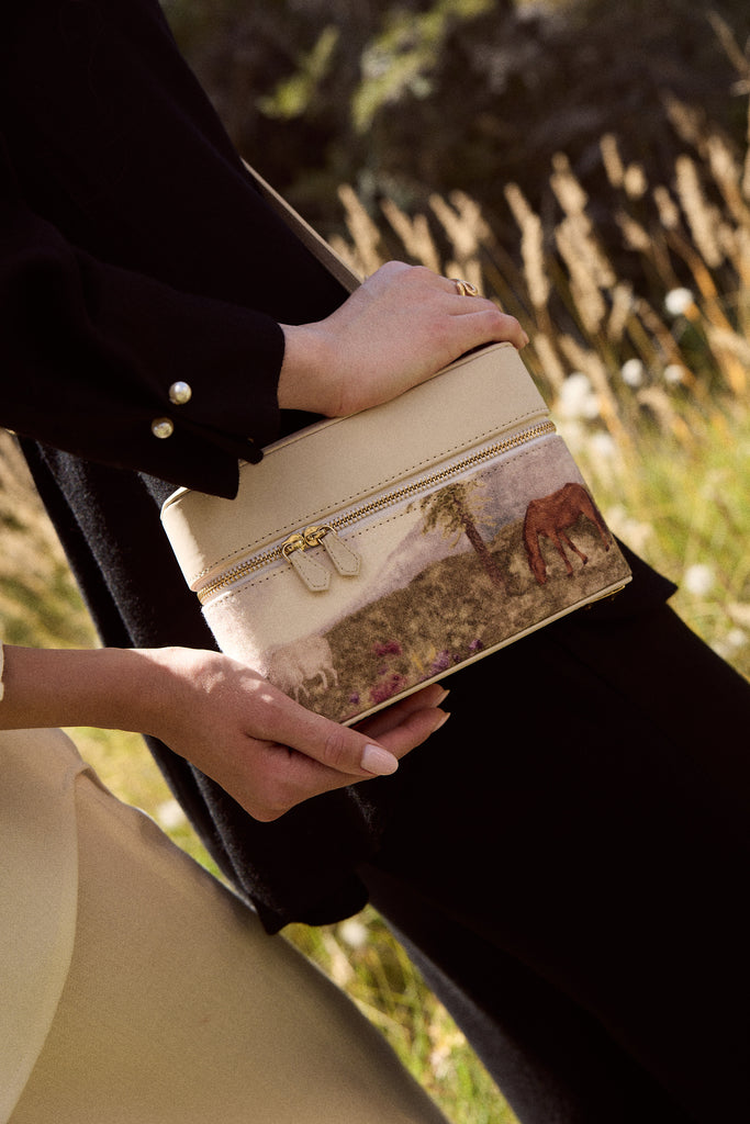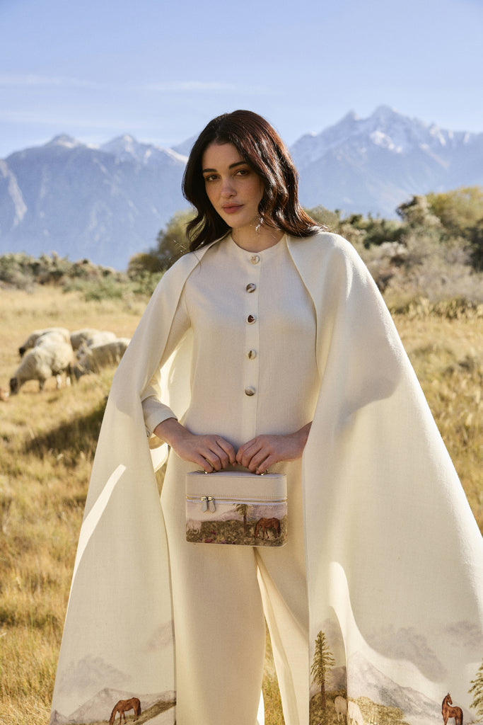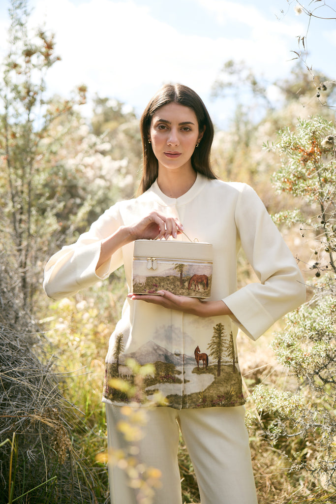 Crafted in vegan leather and 100% soft wool, this newly launched handbag features a hand-illustrated artwork that beautifully captures the soul of the Himalayan valley. The serene scene of grazing horses and distant mountains is first illustrated by hand and then printed onto wool, bringing texture and life to every detail. Finished with gold hardware and a detachable crossbody strap, it blends artistry with functionality. Pair it with our printed ensembles for a harmonious, travel-inspired look, or contrast it with deep hues to let the landscape print take center stage.