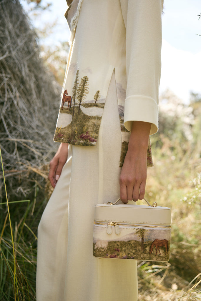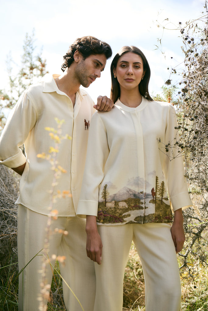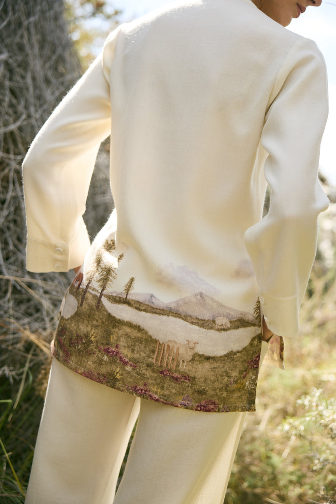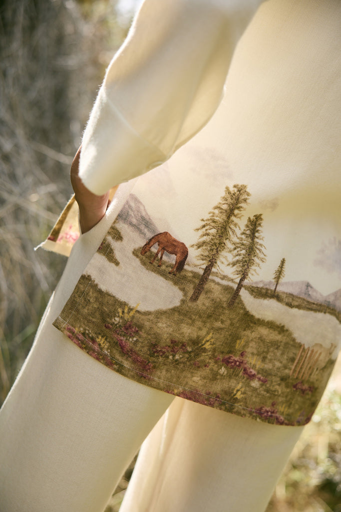 This season introduces a custom print inspired by the whimsical lost valley of the Himalayas. Crafted in soft wool, the top depicts a serene landscape where horses and sheep graze by alpine trees, snow-dusted peaks rise in the distance, and florals bloom across the valley river. The hidden placket keeps the front clean and minimal, with a single printed button placed at the center, seamlessly joining the scenic artwork across the front. A piece that wears like a painting, it carries the spirit of the mountains with quiet elegance and fluid ease.