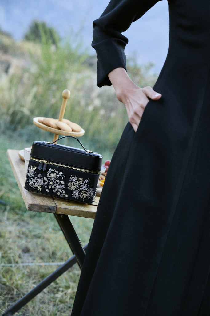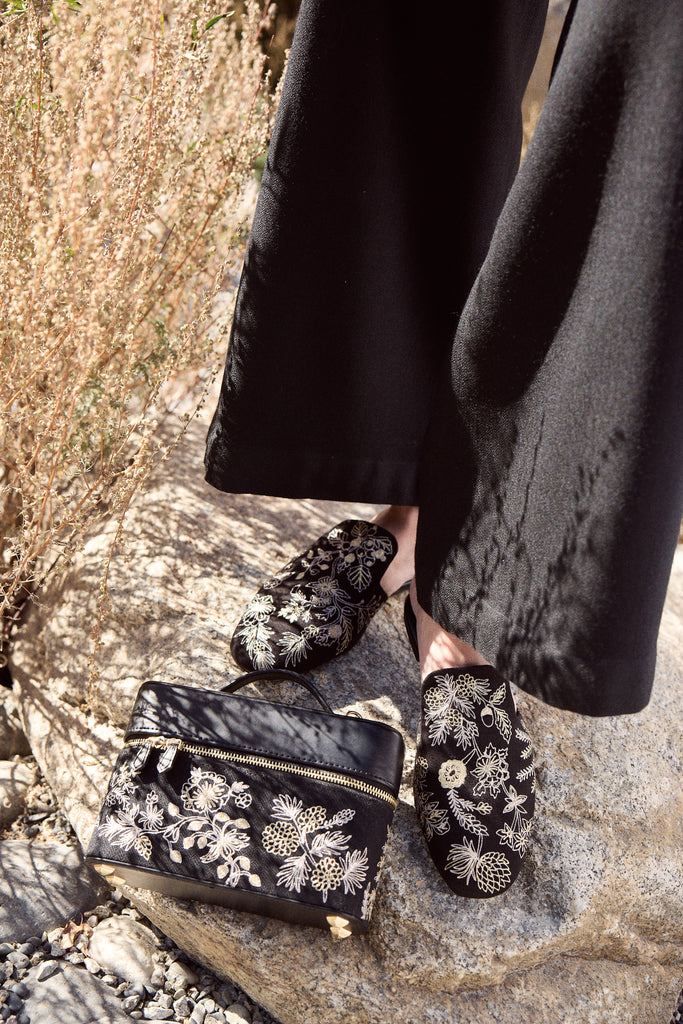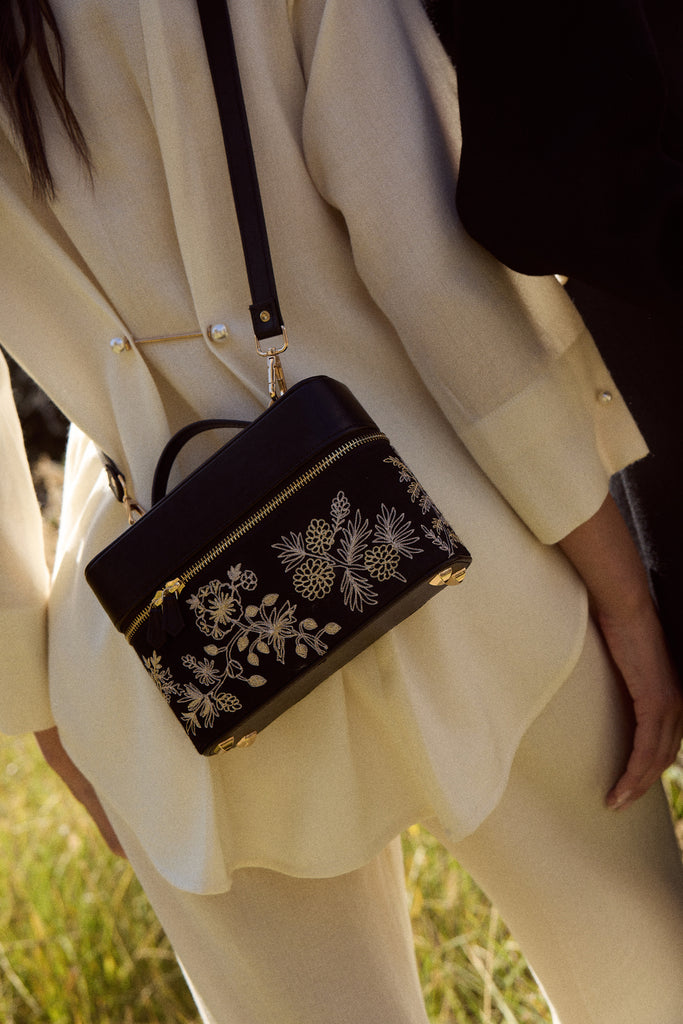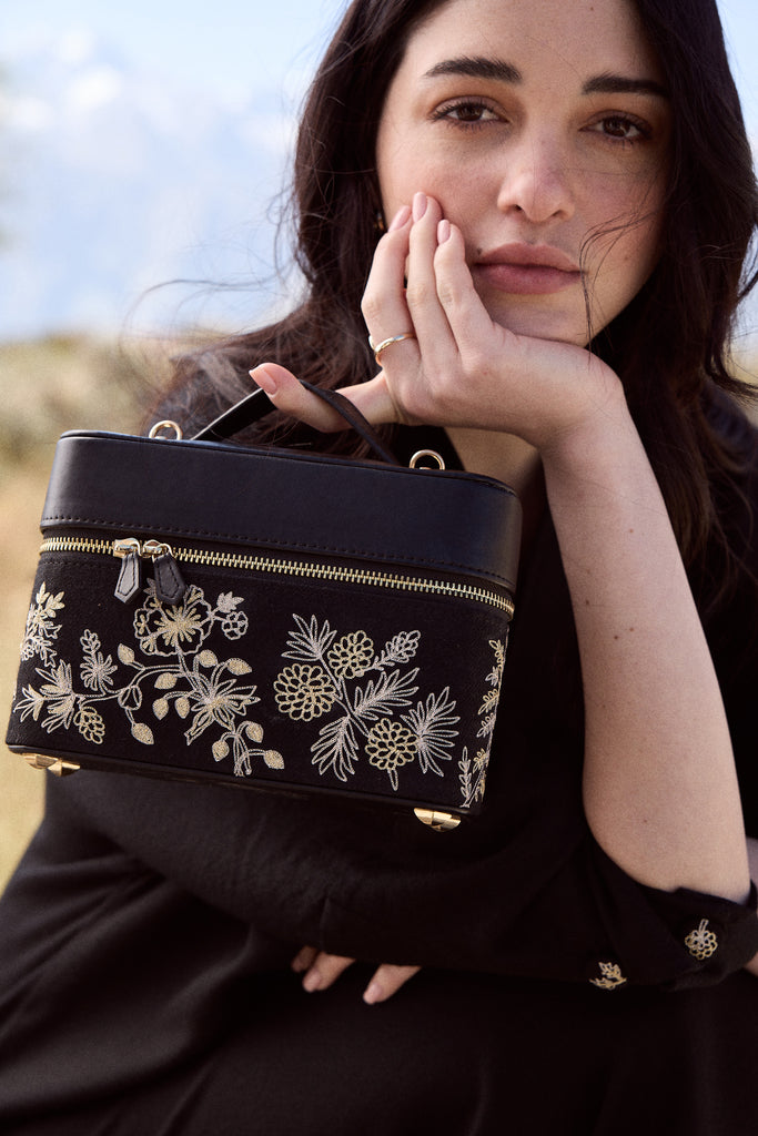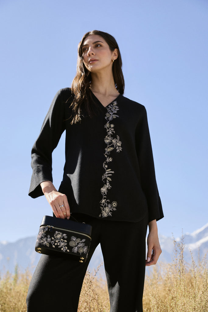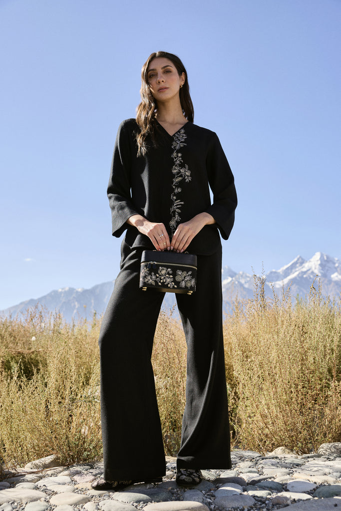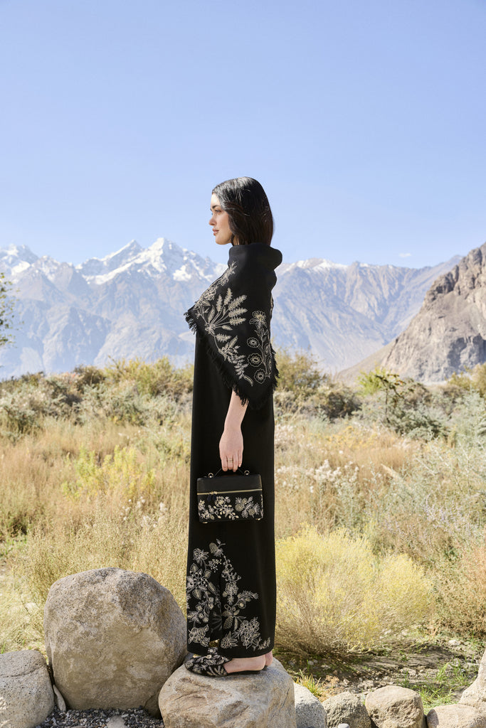 Crafted in black vegan leather and 100% soft wool, this elegant handbag is intricately embroidered in soft gold and silver metallic threads, depicting the enchanting flora and fauna of the Himalayan valley. Its structured form, glinting hardware, and refined detailing make it a timeless statement of sophistication. Effortless and versatile, it elevates any all-black ensemble with a touch of quiet opulence. Style it with its matching embroidered shoes for a coordinated, high-impact look that’s both graceful and striking.