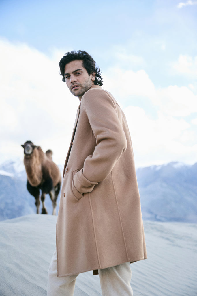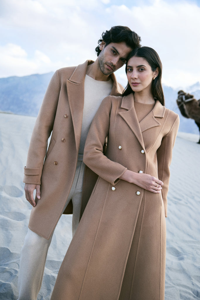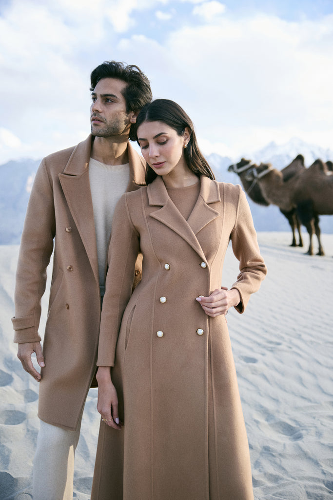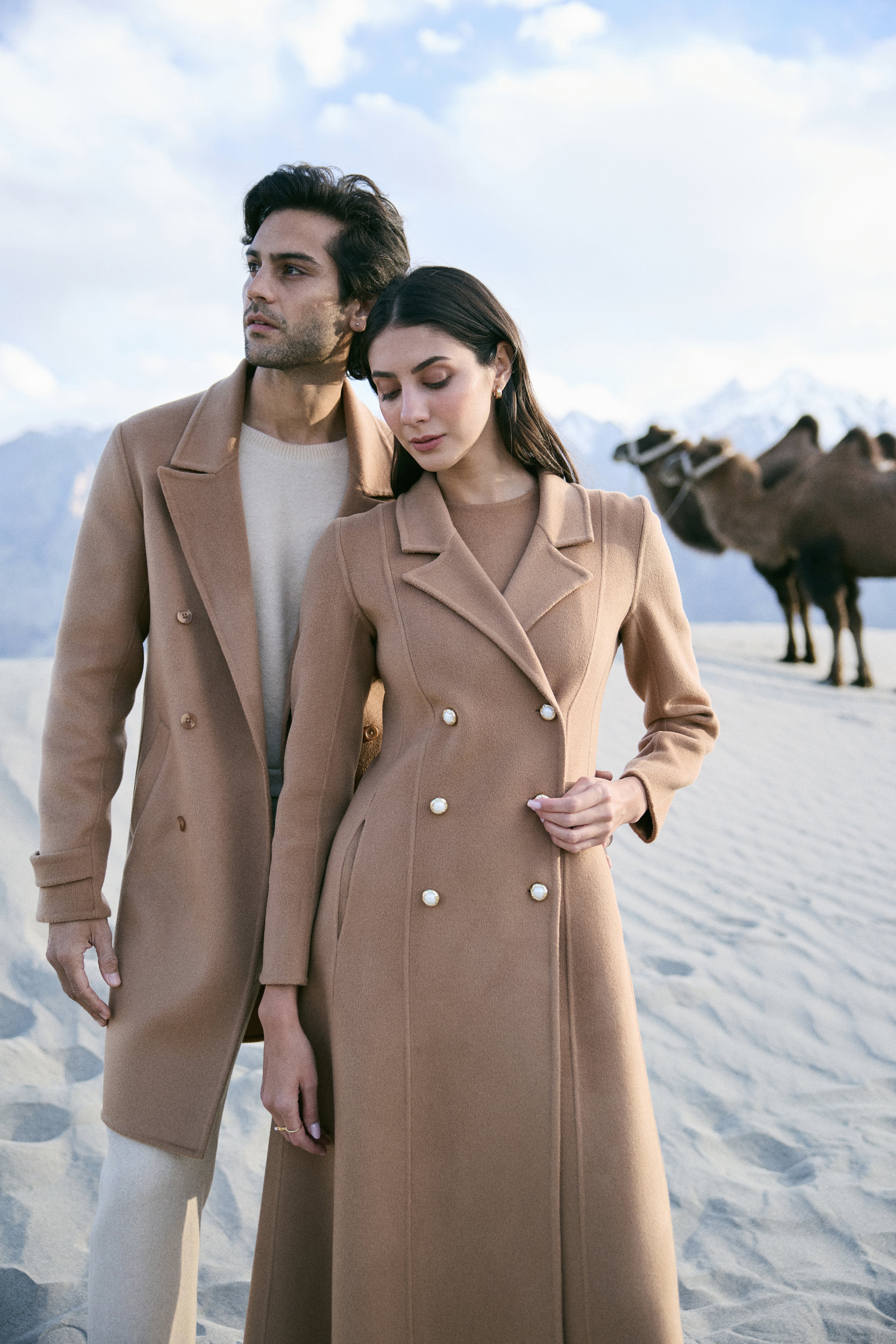 Cashmere-Silk-Merino Blend Long Coat (Warm Honey) & Merino Wool Blend Tapered Trousers- MAN (Oatmeal)