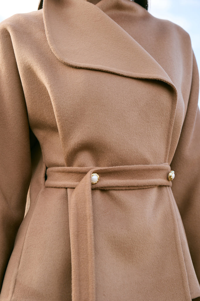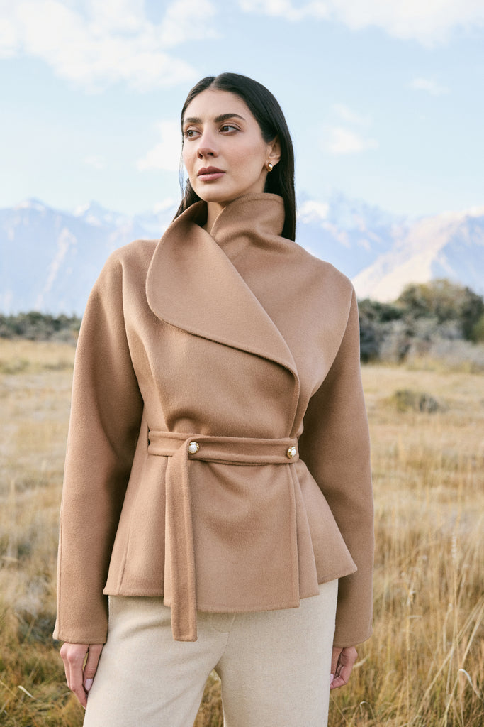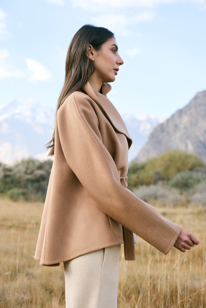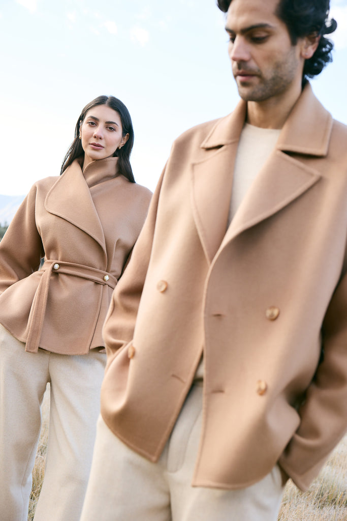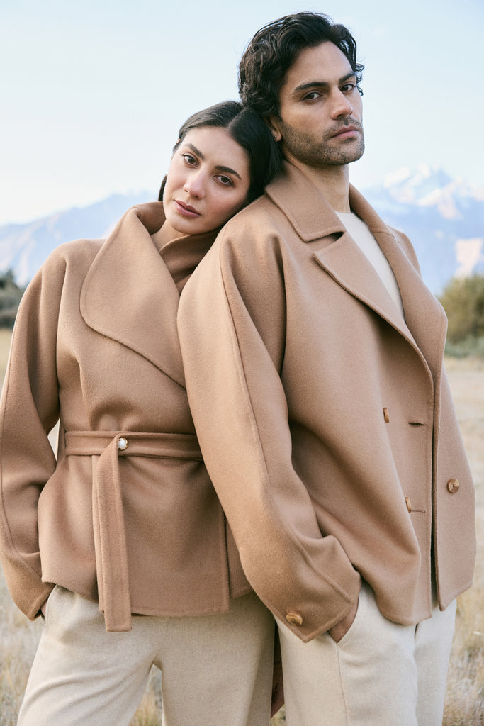 Cashmere-Silk-Merino Blend Wrap Coat (Warm Honey) - At the heart of this season lies our most luxurious fabric: a rare composition of 20% Cashmere, 60% Merino Wool, 10% Silk, and 10% Recycled Binding Fiber. Designed to carry you through the depths of winter with ease, the fabric combines the lofty softness of cashmere, the resilience of merino, and the lustrous drape of silk. Its construction is light as air yet intensely insulating, offering warmth without bulk. A dual-sided weave ensures that the same supple richness touches both skin and surface, while its fluid structure lends itself to precise tailoring and sculpted silhouettes. Elevated, enduring, and indulgent- this is outerwear at its most refined expression.Click Here