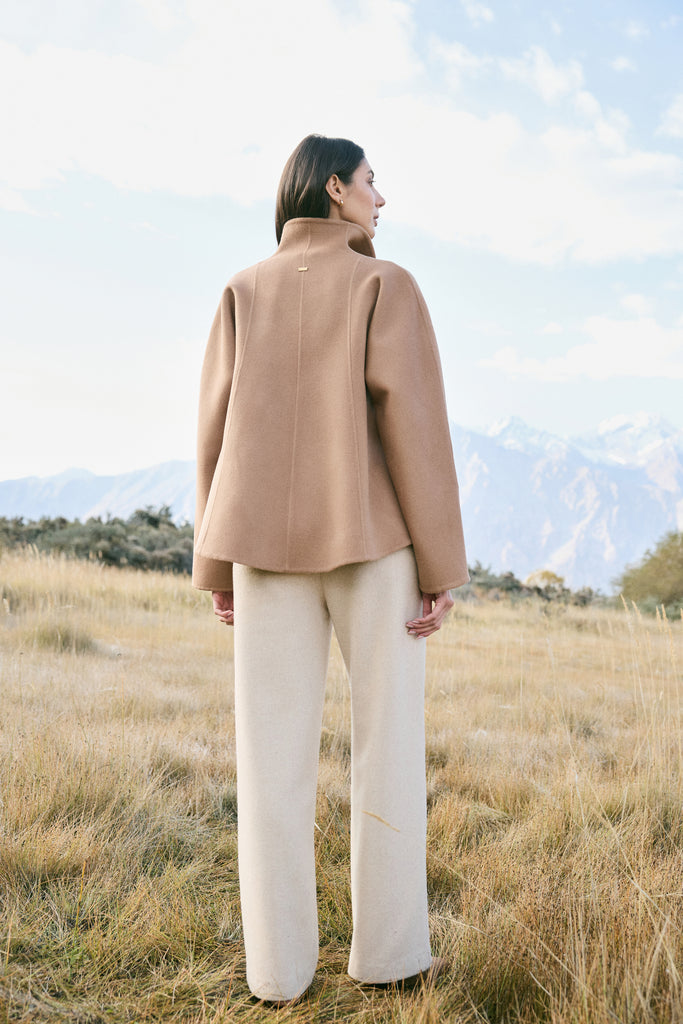 Cashmere-Silk-Merino Blend Wrap Coat (Warm Honey) & Merino Wool Blend New Pants (Oatmeal)