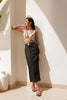 Slim high waist skirt with side panel soft elastication. The side elastication has a stretchability of 6 inches making it extra comfortable and flattering on the body with an added design detail. The fitted skirt also comes with a back slit and a centre long zip.