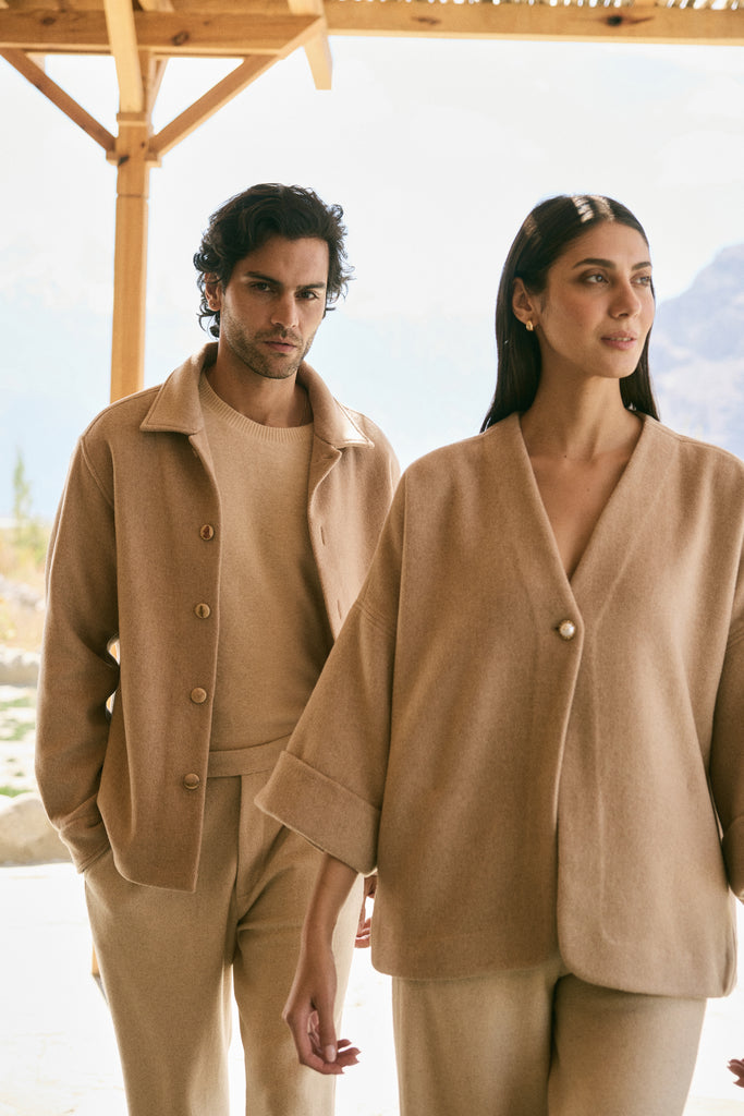 Valley Button Print Overshirt -Man (Oatmeal) - Introducing the all-new Merino Wool Blend- a luxurious mix of 50% merino wool and 50% recycled fiber, crafted at 480 gsm. Ultra-soft and warm, it offers comfort even in temperatures as low as 5°C. Smooth and breathable, it feels soothing against the skin, elevating every wear.Click Here