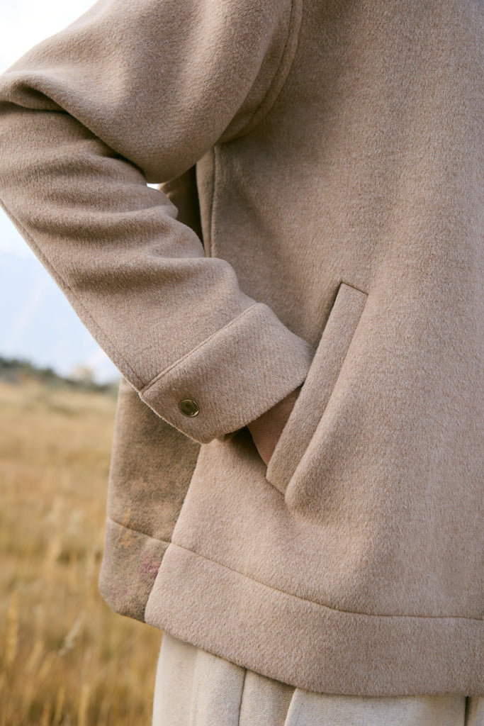 Valley Print Varsity Jacket -Man (Oatmeal) - Introducing the all-new Merino Wool Blend- a luxurious mix of 50% merino wool and 50% recycled fiber, crafted at 480 gsm. Ultra-soft and warm, it offers comfort even in temperatures as low as 5°C. Smooth and breathable, it feels soothing against the skin, elevating every wear.Click Here